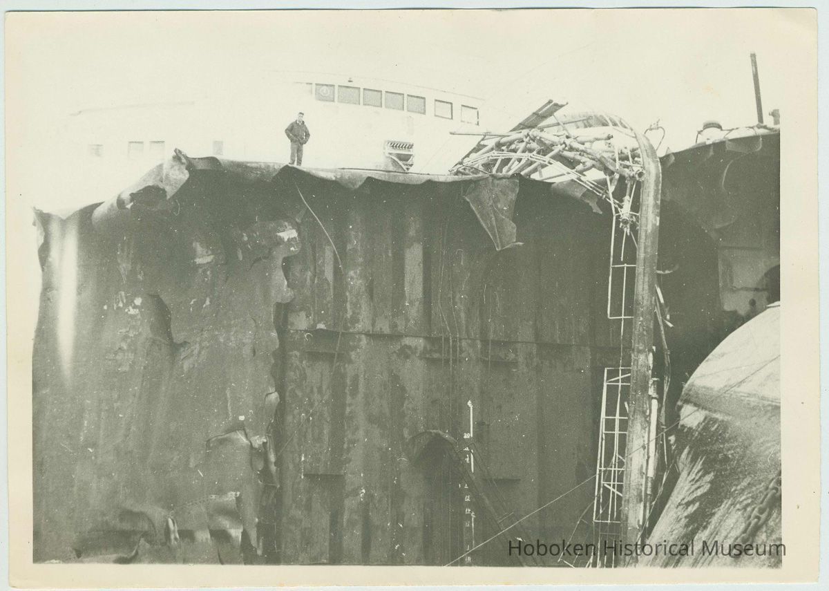 This image is one of six images showing damage to this vessel and repairs, photo catalog 2001.001.0192 to 2001.001.0197. While possibly in Hoboken, some of the dock equipment and skyline in the background suggest that this was in Brooklyn and earlier than 1940.