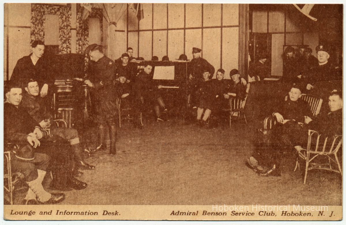 Postcard: photo view of the Lounge & Information Desk, Admiral Benson Service Club, Hoboken, n.d., ca. 1918-1919.