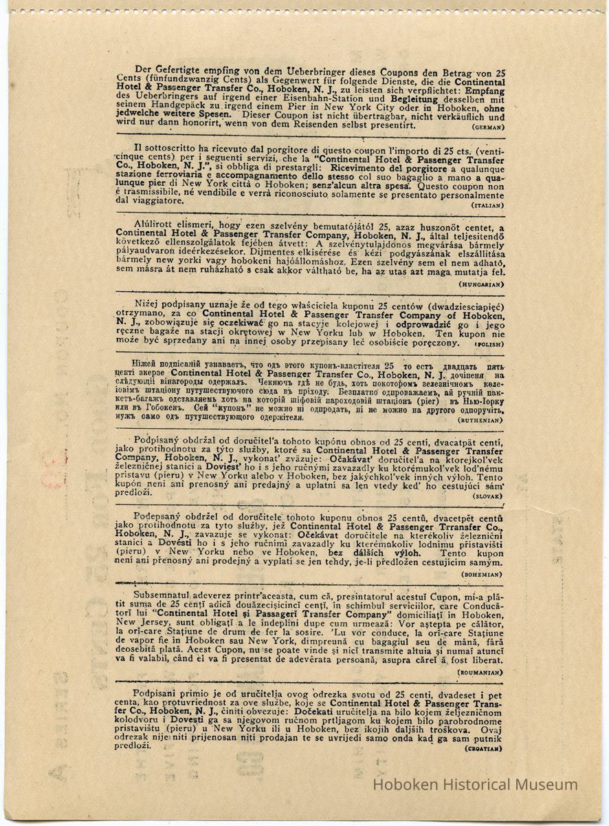 Coupon for transportation & baggage transfer by Continental Hotel & Passenger Transfer Co., Hoboken, to any steamship piers in N.Y. or Hoboken, n.d., ca. 1920-1930. Unused.