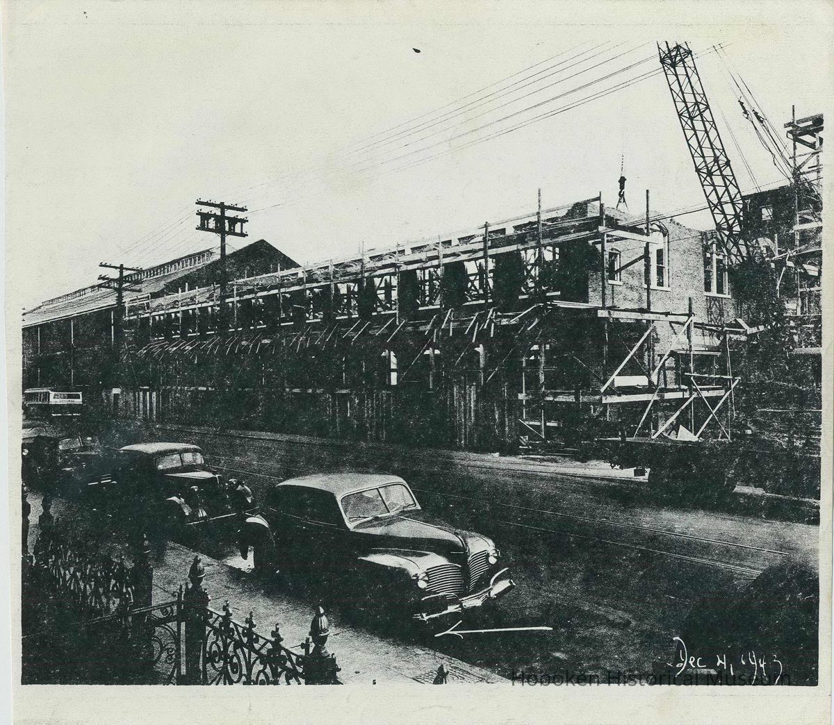 B+W photocopy of photo of construction of the south extension of the machine shop at the Bethlehem Steel Shipyard, Hoboken Division, Hoboken, Dec. 4, 1943. 8-1/2" x 10" leaf. Reverse is blank. Source of original images not indicated.