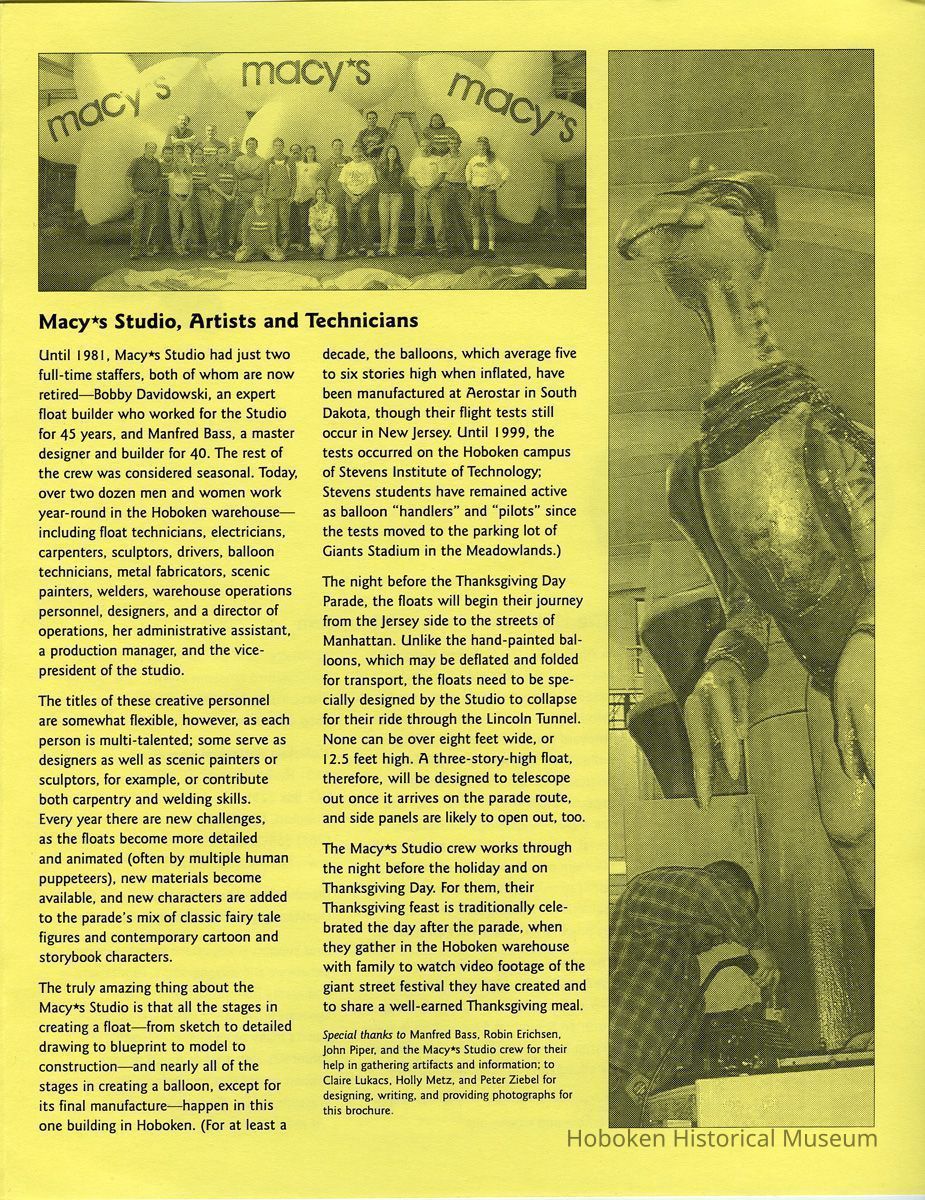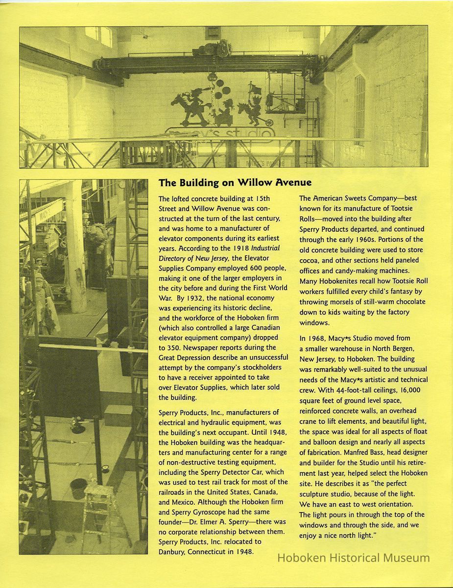 Notes: Archives 2015.003.0013 ==== [page 1] Macy*s Studio, Hoboken, New Jersey An Exhibit at the Hoboken Historical Museum November 15, 2001-February 24, 2002 Celebrating Thirty-Three Years of Creating Thanksgiving Day Parade Magic in the Mile Square City Since 1968, an unobtrusive warehouse on Willow Avenue and Fifteenth Street in Hoboken has been the oversized workshop of Macy*s Studio. Here, generations of skilled artists, builders, and technicians have worked year-round to create the giant, hand-painted balloon figures and intricate floats that are the heart of New York City’s Thanksgiving Day Parade. The Parade celebrates its 75th anniversary this year. It has grown from a few simple floats, bands, costumed Macy*s employees, and some animals borrowed from the Central Park Zoo, to a vast theater-in-the-round performance with dozens of marching bands, huge animated floats, and giant helium and cold air balloons propelled by thousands of volunteer balloon handlers, dancers, clowns, and cheerleaders. Millions of spectators now watch along the Manhattan streets and via television. And it all starts here. With Macy*s Studio, Hoboken, New Jersey, the Hoboken Historical Museum aims to celebrate our city’s 33-year contribution to the annual parade. You’ll meet the Macy*s Studio crew, and see some of the Stevens Institute of Technology students who have volunteered over the years as balloon “pilots” and “handlers.” And with models, drawings, and other elements from Macy*s Studio, we’ll show you how steel, Fiberglas, foam, chicken wire, and urethane-coated nylon are transformed into storybook characters, or Mickey Mouse, Sonic, Betty Boop, and Bart Simpson. We’ll take you inside the magic factory. ==== [page 2] The Building on Willow Avenue The lofted concrete building at 15th Street and Willow Avenue was constructed at the turn of the last century, and was home to a manufacturer of elevator components during its earliest years. According to the 1918 Industrial Directory of New Jersey, the Elevator Supplies Company employed 600 people, making it one of the larger employers in the city before and during the First World War. By 1932, the national economy was experiencing its historic decline, and the workforce of the Hoboken firm (which also controlled a large Canadian elevator equipment company) dropped to 350. Newspaper reports during the Great Depression describe an unsuccessful attempt by the company’s stockholders to have a receiver appointed to take over Elevator Supplies, which later sold the building. Sperry Products, Inc., manufacturers of electrical and hydraulic equipment, was the building’s next occupant. Until 1948, the Hoboken building was the headquarters and manufacturing center for a range of non-destructive testing equipment, including the Sperry Detector Car, which was used to test rail track for most of the railroads in the United States, Canada, and Mexico. Although the Hoboken firm and Sperry Gyroscope had the same founder — Dr. Elmer A. Sperry — there was no corporate relationship between them. Sperry Products, Inc. relocated to Danbury, Connecticut in 1948. The American Sweets Company [sic - Sweets Company of America] — best known for its manufacture of Tootsie Rolls — moved into the building after Sperry Products departed, and continued through the early 1960s. Portions of the old concrete building were used to store cocoa, and other sections held paneled offices and candy-making machines. Many Hobokenites recall how Tootsie Roll workers fulfilled every child’s fantasy by throwing morsels of still-warm chocolate down to kids waiting by the factory windows. In 1968, Macy*s Studio moved from a smaller warehouse in North Bergen, New Jersey, to Hoboken. The building was remarkably well-suited to the unusual needs of the Macy*s artistic and technical crew. With 44-foot-tall ceilings, 16,000 square feet of ground level space, reinforced concrete walls, an overhead crane to lift elements, and beautiful light, the space was ideal for all aspects of float and balloon design and nearly all aspects of fabrication. Manfred Bass, head designer and builder for the Studio until his retirement last year, helped select the Hoboken site. He describes it as “the perfect sculpture studio, because of the light. We have an east to west orientation. The light pours in through the top of the windows and through the side, and we enjoy a nice north light.” ==== [page 3] Macy*s Studio, Artists and Technicians Until 1981, Macy*s Studio had just two full-time staffers, both of whom are now retired — Bobby Davidowski, an expert float builder who worked for the Studio for 45 years, and Manfred Bass, a master designer and builder for 40. The rest of the crew was considered seasonal. Today, over two dozen men and women work year-round in the Hoboken warehouse — including float technicians, electricians, carpenters, sculptors, drivers, balloon technicians, metal fabricators, scenic painters, welders, warehouse operations personnel, designers, and a director of operations, her administrative assistant, a production manager, and the vice-president of the studio. The titles of these creative personnel are somewhat flexible, however, as each person is multi-talented; some serve as designers as well as scenic painters or sculptors, for example, or contribute both carpentry and welding skills. Every year there are new challenges, as the floats become more detailed and animated (often by multiple human puppeteers), new materials become available, and new characters are added to the parade’s mix of classic fairy tale figures and contemporary cartoon and storybook characters. The truly amazing thing about the Macy*s Studio is that all the stages in creating a float — from sketch to detailed drawing to blueprint to model to construction — and nearly all of the stages in creating a balloon, except for its final manufacture — happen in this one building in Hoboken. (Fo