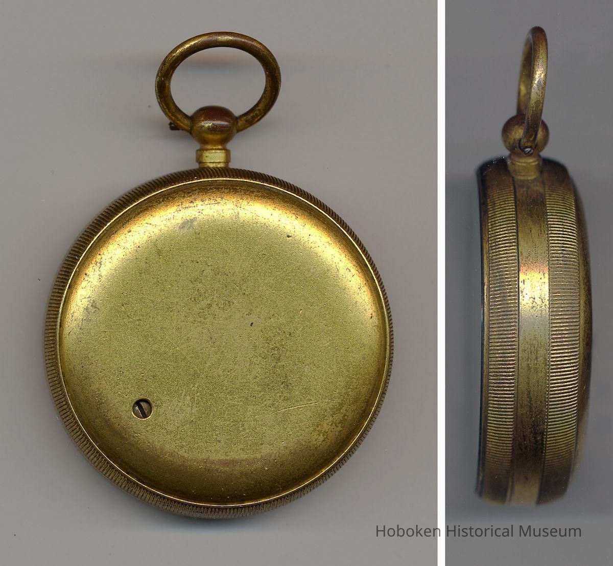 Aneroid surveying barometer, watch pattern, probably model no. 5855, sold by Keuffel & Esser Co., N.Y., no date, circa 1920-1940. Gold finish metal case, 1/3/4" diameter; silvered dial; revolving altitude scale (bezel) 3000 feet; compensated for temperature. "Made in England" as stated on dial. Morroco case as listed in catalogue not present.
