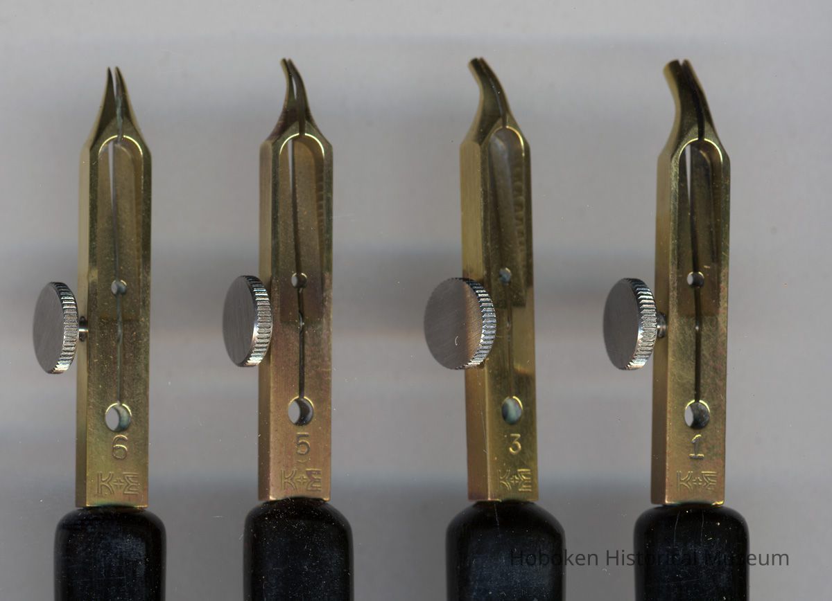 Barch-Payzant Lettering Pen Set, product no. N3255, made by Keuffel & Esser Co., (Hoboken), no date, circa 1943-1954. Paper covered cardboard slipcase box with fitted interior; contents present: four pens of the six called for (Numbers 1, 3, 5 and 6 as stated in catalog; lacking nos. 7 and 8 which would complete this set); printed paper label on tray end. Pens are 7" long with black painted holder with machined brass nibs; cork protectors. Each nib is marked K&E along with the pen size number.