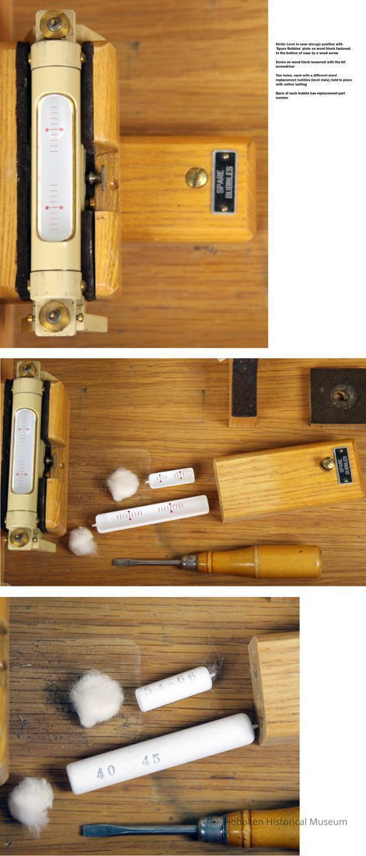 Note: "Spare Bubbles" marked with plate on wood block secured to case bottom below striding level storage slot. Each bubble is marked with its replacement part number.