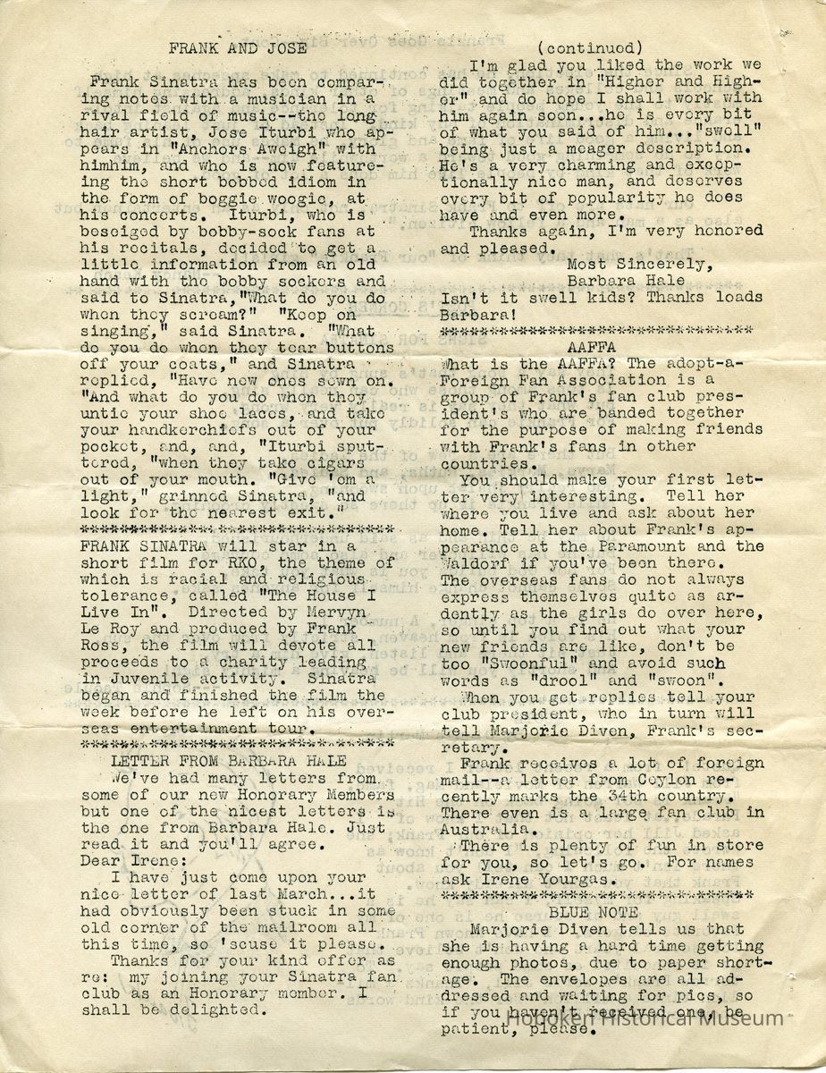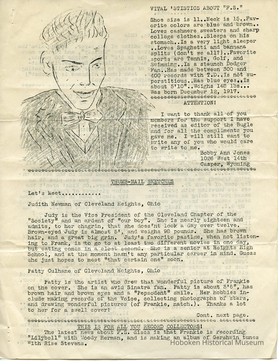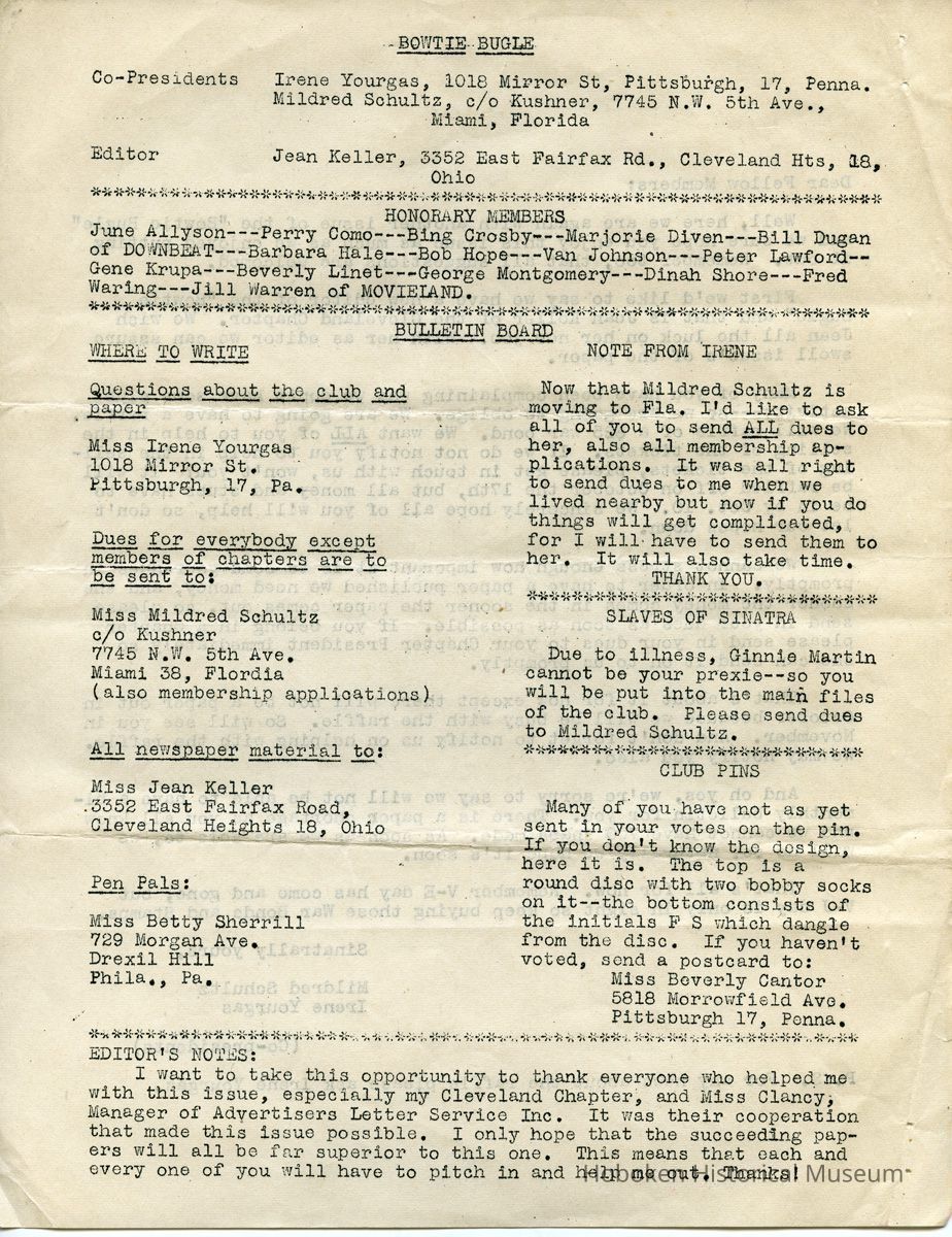 Notes: Archives 2015.030.2007 ==== Bowtie Bugle. Edition Number 7. Published by "The Society for Souls Suffering from Sinatritis." ==== [page 1] Dear Fellow Members: Well, here we are again with another issue of the "Bowtie Bugle" and we sure hope you enjoy this issue as much as we enjoyed putting it out. Remember too, that all suggestions are welcomed. First we'd like to say we have a new editor of the "Bowtie Bugle" and that is Joan Keller of the Cleveland Chapter. We wish Jean all the luck on her now job. With her as editor we can assure swell issue's of the paper. Many of you have been complaining why we don't have some club activity so we are going to oblige. We are going to have a raffle. We will raffle of a $25 war bond. We want ALL of you to help in the selling of the tickets. If we do not notify you to help in the selling of the tickets, please get in touch with us, won't you? It will be raffled off on ctober the 17th, but all money and stubs have to be in by Oct. 10. We sincerely hope all of you will help, so don't let our hopes down. We cannot stress enough how important it is to send your dues in promptly. In order to have a paper published we need money, and the sooner the money comes In the sooner the paper comes out, so please send In your dues as soon as possible. If you belong in a Chapter please send in your dues to your Chapter President immediately so she can send it on to us promptly. That's about It for now except there will not be a paper out in October because we will be busy with the raffle. So will see you in November. And don't forget to notify us on helping with the raffle. We may notify you also. And oh yes, we're sorry to say we will not be able to have a bi-monthly bulletin for you. There is a paper shortage as you all know and we cannot have 700 snaps made. As soon as we are able to, we will do so, naturally wo hope It's soon. That's all for now. Remember V-E day has come and gone, but V-J day is only in sight so keep buying those War Bonds and Stamps. Sinatrally yours, Mildred Schultz Irene Yourgas (Co-presidents) P. S. For any news about the raffle please ask Irene Yourgas. ==== [page 2] - BOWTIE -- BUGLE Co-Presidents Irene Yourgas, 1018 Mirror St, Pittsburgh, 17, Penna Mildred Schultz, c/o Kushner, 7745 N.W, 5th Ave., Miami, Florida Editor Jean Keller, 3352 East Fairfax Rd., Cleveland Hts, 38, Ohio HONORARY MEMBERS June Allyson - Perry Como - Bing Crosby - Marjorie Diven - Bill Dugan of DOWNBEAT - Barbara Hale - Bob Hope - Van Johnson - Peter Lawford Gene Krupa - Beverly Llnet- George Montgomery -Dinah Shore - Fred Waring - Jill Warren of MOVIEIAND. BULLETIN BOARD WHERE TO WRITE Questions about the club and paper .... Miss Irene Yourgas 1018 Mirror St. Pittsburgh, 17, Pa. Dues for everybody except members of chapters are to be sent to: Miss Mildred Schultz c/o Kushner 7745 N.W. 5th Ave. Miami 38, Flordia (also membership applications) All newspaper material to: Miss Jean Keller 3352 East Fairfax Road, Cleveland Heights 18, Ohio Pen Pals: Miss Betty Sherrill 729 Morgan Ave. DrexEl Hill Phila., Pa,. NOTE FROM IRENE Now that Mildred Schultz is moving to Fla, I’d like to ask all of you to send ALL dues to her, also all membership applications. It was all right to send dues to me when we lived nearby but now if you do things will get complicated, for I will have to send them to her. It will also take time, THANK YOU. SLAVES OF SINATRA Due to illness, Ginnie Martin cannot be your prexie — so you will be put into the main files of the club. Please send dues to Mildred Schultz. CLUB PINS Many of you have not as yet sent in your votes on the pin. If you don’t know the design, here it is. The top is a round disc with two bobby socks on it -- the bottom consists of the initials F S which dangle from the disc. If you haven’t voted, send a postcard to: Miss Beverly Cantor 5818 Morrowfield Ave. Pittsburgh 17, Penna. DITOR’S NOTES: I want to take this opportunity to thank everyone who helped me with this issue, especially my Cleveland Chapter, and Miss Clancy; Manager of Advertisers Letter Service Inc. It was their cooperation that made this issue possible, I only hope that the succeeding papers will all be far superior to this one. This means that each and every one of you will have to pitch in and help me out. Thanks! ==== [page 3] FRANKIE GOES OVER BIG WITH G.I'S Recently the movie editor of the Akron Beacon Journal wrote of the big hit Frank Sinatra made with the G. I's and also of the feud between Frank and the Army paper "Stars and Stripes." When Frank got back from his overseas tour he said that the boys made many complaints to him about the quality of the shows sent them aand Frank thought something ought to be done about it. Well, it seems as though the army paper thinks Frankie doesn't know what he is talking about and doesn't have any right voicing his opinions. This editorial is by a soldier named Abe Kramer writing in "Depo-Dope", publication of Cazes air depot at Casablanca. He says: "So we saw Frankie in the flesh -- that's giving him the benefit of the doubt, of course. On the face of it, one might think a guy in his peculiar situation had two strikes on him before coming overseas to perform for G. I's. Maybe so. Maybe It was only morbid curiosity that packed every theater in the Casablanca vicinity he played in, full to the rafters with soldiers and sailors. Maybe it wasn't Sinatra at all, but more to see the excellent comedian Phil Silvers, and the two pretty girls in the troupe that brought the boys flocking from all points’"; Anyway after they came and saw and heard, the consensus was that (1) Sinatra doesn't sing badly at all — in fact he is a darned good singer, (2) he is a likable guy, (3) it was one of the best shows ever to hit this area. In other words, "the Voice" scored a hit with the hardboiled G. I's, the same as he did with their kid sisters back home. They appreciate the way members of his troupe cheerfully agreed to a ja
