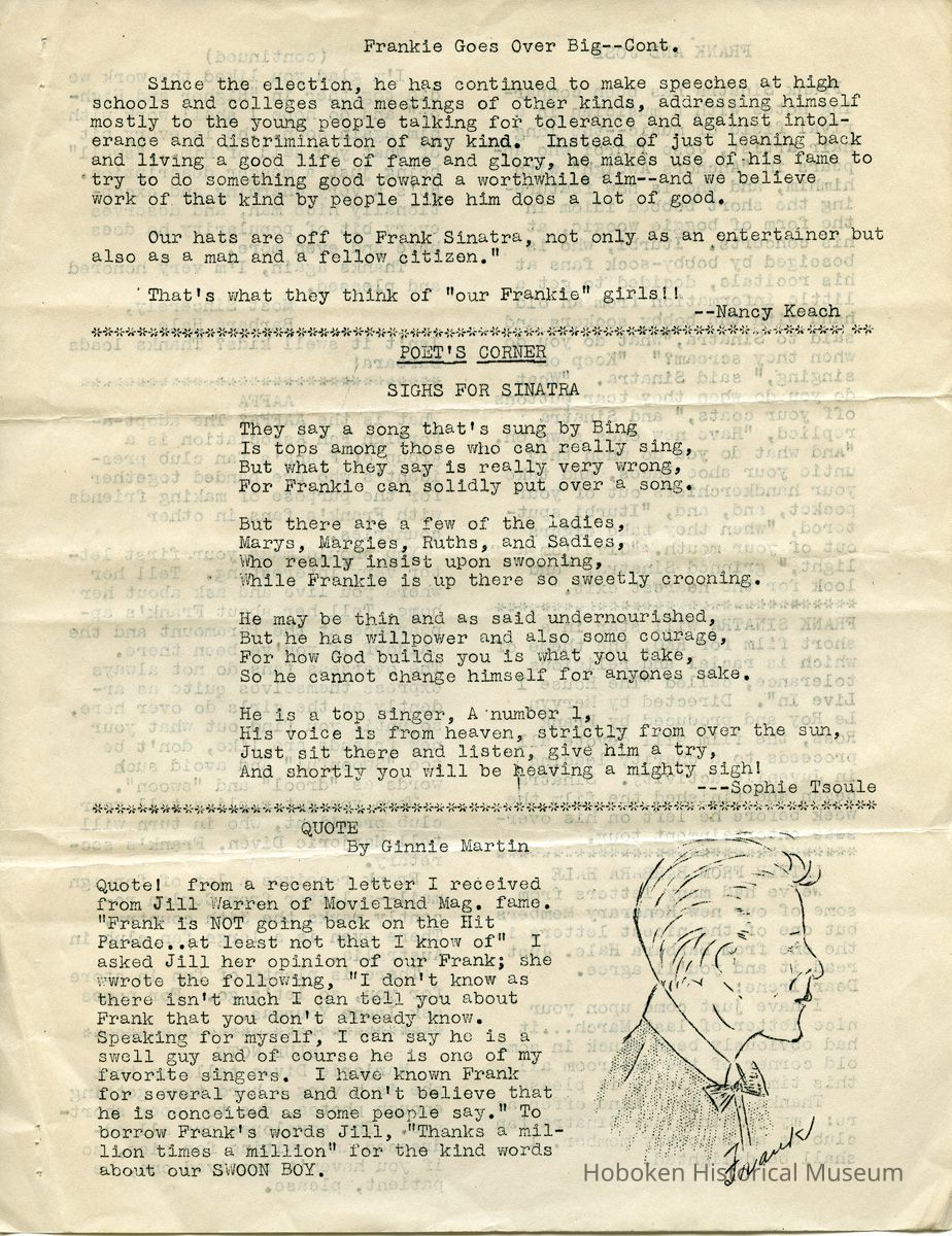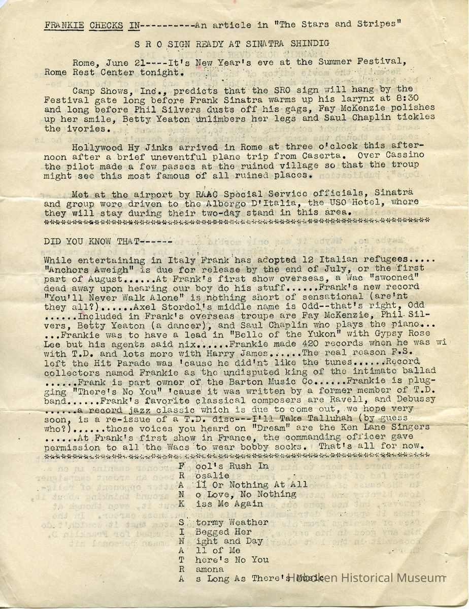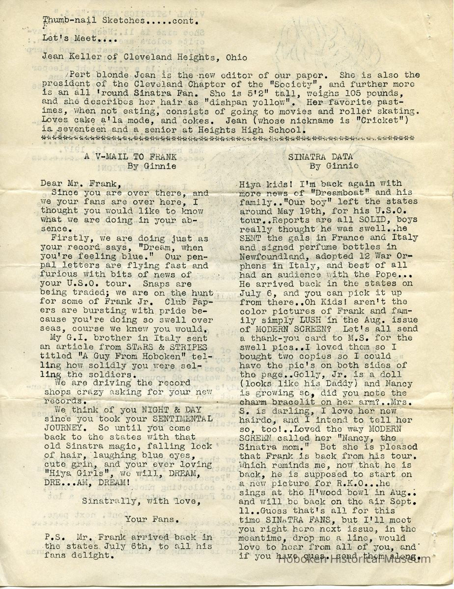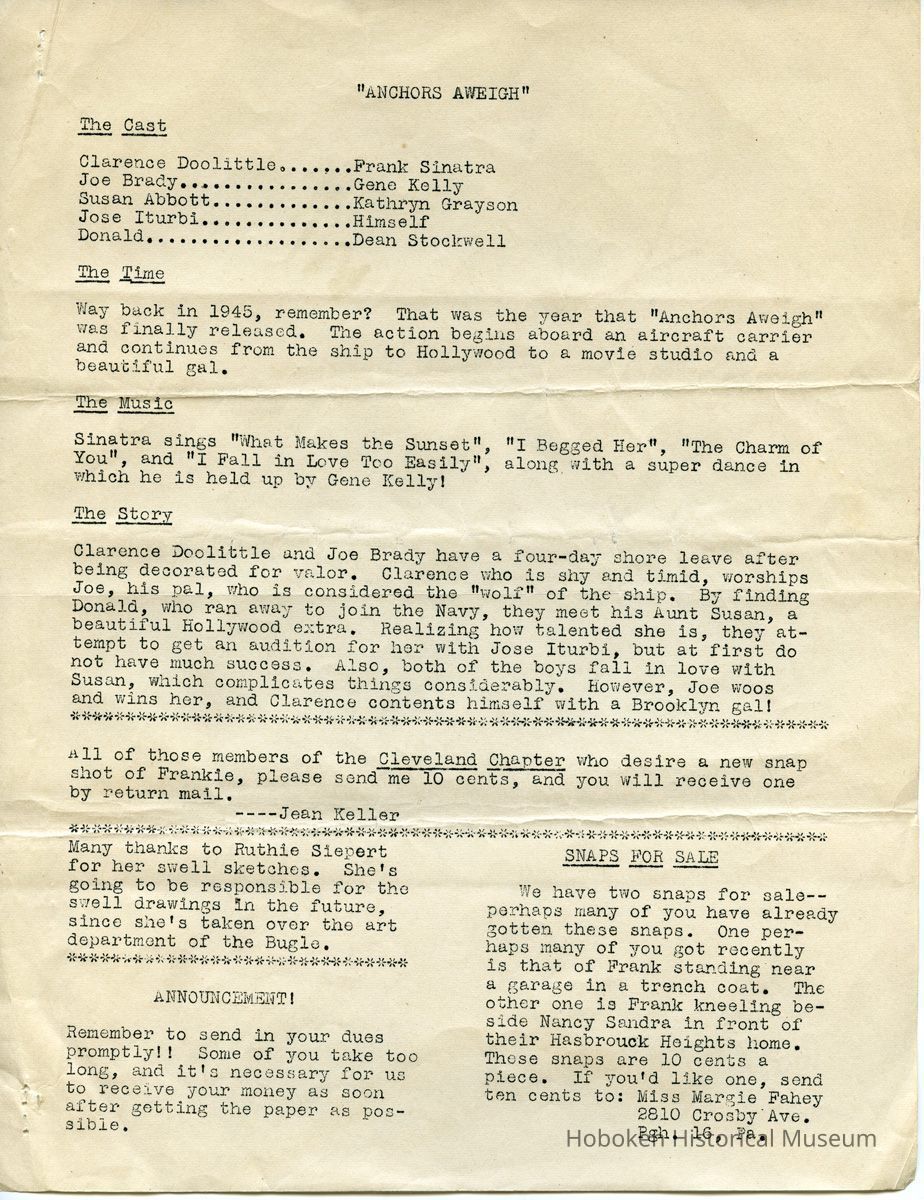 Notes: Archives 2015.030.2007 ==== Bowtie Bugle. Edition Number 7. Published by "The Society for Souls Suffering from Sinatritis." ==== [page 1] Dear Fellow Members: Well, here we are again with another issue of the "Bowtie Bugle" and we sure hope you enjoy this issue as much as we enjoyed putting it out. Remember too, that all suggestions are welcomed. First we'd like to say we have a new editor of the "Bowtie Bugle" and that is Joan Keller of the Cleveland Chapter. We wish Jean all the luck on her now job. With her as editor we can assure swell issue's of the paper. Many of you have been complaining why we don't have some club activity so we are going to oblige. We are going to have a raffle. We will raffle of a $25 war bond. We want ALL of you to help in the selling of the tickets. If we do not notify you to help in the selling of the tickets, please get in touch with us, won't you? It will be raffled off on ctober the 17th, but all money and stubs have to be in by Oct. 10. We sincerely hope all of you will help, so don't let our hopes down. We cannot stress enough how important it is to send your dues in promptly. In order to have a paper published we need money, and the sooner the money comes In the sooner the paper comes out, so please send In your dues as soon as possible. If you belong in a Chapter please send in your dues to your Chapter President immediately so she can send it on to us promptly. That's about It for now except there will not be a paper out in October because we will be busy with the raffle. So will see you in November. And don't forget to notify us on helping with the raffle. We may notify you also. And oh yes, we're sorry to say we will not be able to have a bi-monthly bulletin for you. There is a paper shortage as you all know and we cannot have 700 snaps made. As soon as we are able to, we will do so, naturally wo hope It's soon. That's all for now. Remember V-E day has come and gone, but V-J day is only in sight so keep buying those War Bonds and Stamps. Sinatrally yours, Mildred Schultz Irene Yourgas (Co-presidents) P. S. For any news about the raffle please ask Irene Yourgas. ==== [page 2] - BOWTIE -- BUGLE Co-Presidents Irene Yourgas, 1018 Mirror St, Pittsburgh, 17, Penna Mildred Schultz, c/o Kushner, 7745 N.W, 5th Ave., Miami, Florida Editor Jean Keller, 3352 East Fairfax Rd., Cleveland Hts, 38, Ohio HONORARY MEMBERS June Allyson - Perry Como - Bing Crosby - Marjorie Diven - Bill Dugan of DOWNBEAT - Barbara Hale - Bob Hope - Van Johnson - Peter Lawford Gene Krupa - Beverly Llnet- George Montgomery -Dinah Shore - Fred Waring - Jill Warren of MOVIEIAND. BULLETIN BOARD WHERE TO WRITE Questions about the club and paper .... Miss Irene Yourgas 1018 Mirror St. Pittsburgh, 17, Pa. Dues for everybody except members of chapters are to be sent to: Miss Mildred Schultz c/o Kushner 7745 N.W. 5th Ave. Miami 38, Flordia (also membership applications) All newspaper material to: Miss Jean Keller 3352 East Fairfax Road, Cleveland Heights 18, Ohio Pen Pals: Miss Betty Sherrill 729 Morgan Ave. DrexEl Hill Phila., Pa,. NOTE FROM IRENE Now that Mildred Schultz is moving to Fla, I’d like to ask all of you to send ALL dues to her, also all membership applications. It was all right to send dues to me when we lived nearby but now if you do things will get complicated, for I will have to send them to her. It will also take time, THANK YOU. SLAVES OF SINATRA Due to illness, Ginnie Martin cannot be your prexie — so you will be put into the main files of the club. Please send dues to Mildred Schultz. CLUB PINS Many of you have not as yet sent in your votes on the pin. If you don’t know the design, here it is. The top is a round disc with two bobby socks on it -- the bottom consists of the initials F S which dangle from the disc. If you haven’t voted, send a postcard to: Miss Beverly Cantor 5818 Morrowfield Ave. Pittsburgh 17, Penna. DITOR’S NOTES: I want to take this opportunity to thank everyone who helped me with this issue, especially my Cleveland Chapter, and Miss Clancy; Manager of Advertisers Letter Service Inc. It was their cooperation that made this issue possible, I only hope that the succeeding papers will all be far superior to this one. This means that each and every one of you will have to pitch in and help me out. Thanks! ==== [page 3] FRANKIE GOES OVER BIG WITH G.I'S Recently the movie editor of the Akron Beacon Journal wrote of the big hit Frank Sinatra made with the G. I's and also of the feud between Frank and the Army paper "Stars and Stripes." When Frank got back from his overseas tour he said that the boys made many complaints to him about the quality of the shows sent them aand Frank thought something ought to be done about it. Well, it seems as though the army paper thinks Frankie doesn't know what he is talking about and doesn't have any right voicing his opinions. This editorial is by a soldier named Abe Kramer writing in "Depo-Dope", publication of Cazes air depot at Casablanca. He says: "So we saw Frankie in the flesh -- that's giving him the benefit of the doubt, of course. On the face of it, one might think a guy in his peculiar situation had two strikes on him before coming overseas to perform for G. I's. Maybe so. Maybe It was only morbid curiosity that packed every theater in the Casablanca vicinity he played in, full to the rafters with soldiers and sailors. Maybe it wasn't Sinatra at all, but more to see the excellent comedian Phil Silvers, and the two pretty girls in the troupe that brought the boys flocking from all points’"; Anyway after they came and saw and heard, the consensus was that (1) Sinatra doesn't sing badly at all — in fact he is a darned good singer, (2) he is a likable guy, (3) it was one of the best shows ever to hit this area. In other words, "the Voice" scored a hit with the hardboiled G. I's, the same as he did with their kid sisters back home. They appreciate the way members of his troupe cheerfully agreed to a ja