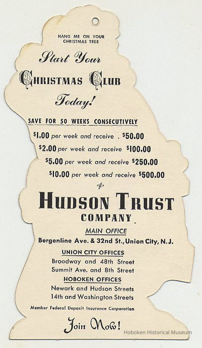 Die-cut Christmas Club promotional card from Hudson Trust Company, Hoboken and other locations, to be used as tree ornament, no date, circa 1950-1965. Die-cut cardstock in shape of Santa Claus, 6-1/2" highx3-1/2" wide, with lithographed image on front; advertising text on the back; hole at top for hanger.