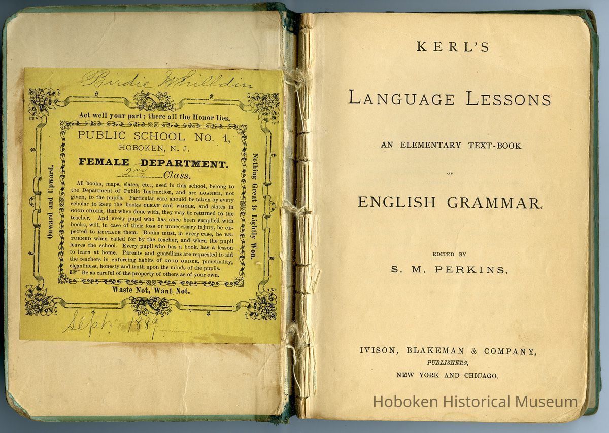 Hoboken Public School No. 1 textbook with decorative school ownership bookplate, 1889.