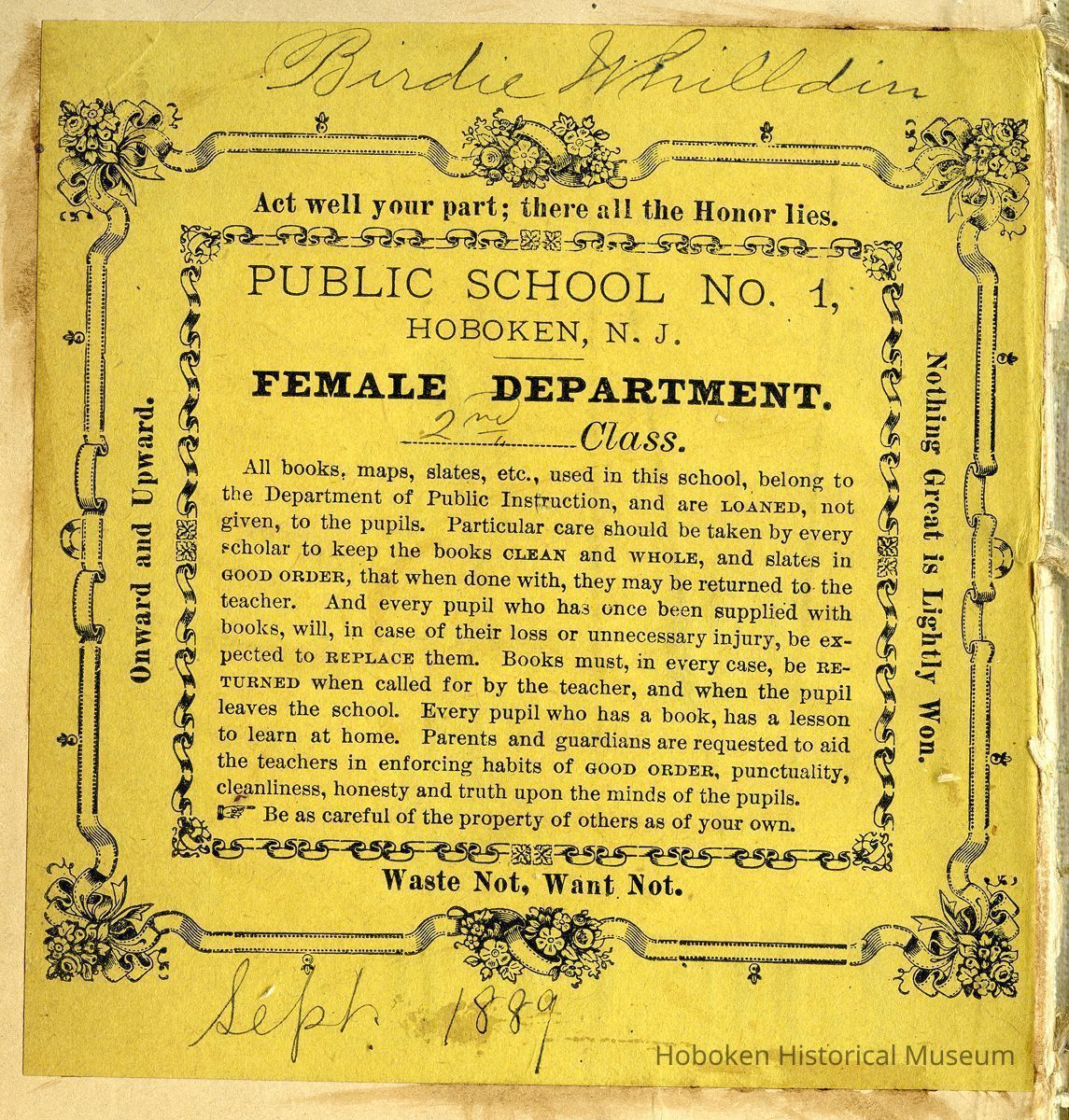 Notes: [ink] Birdie Whilldin [top margin] Act well your part; there all Honor lies. PUBLIC SCHOOL NO. 1, HOBOKEN, N. J. FEMALE DEPARTMENT. [ink[ 2nd [printed] Class. All books, maps, slates, etc., used in this school, belong to the Department of Public Instruction, and are loaned, not given, to the pupils. Particular care should be taken by every scholar to keep the books clean and whole, and slates in good order, that when done with, they may be returned to the teacher. And every pupil who has once been supplied with books, will, in case of their loss or unnecessary injury, be expected to replace them. Books must, in every case, be returned when called for by the teacher, and when the pupil leaves the school. Every pupil who has a book, has a lesson to learn at home. Parents and guardians are requested to aid the teachers in enforcing habits of good order, punctuality, cleanliness, honesty and truth upon the minds of the pupils. Be as careful of the property of others as of your own. ---- [left margin, vertical] Onward and Upward. --- [right margin, vertical] Nothing Great is Lightly Won. [bottom margin] Waste Not, Want Not. [ink] Sept. 1889 Status: OK Status By: dw Status Date: 2015-06-12