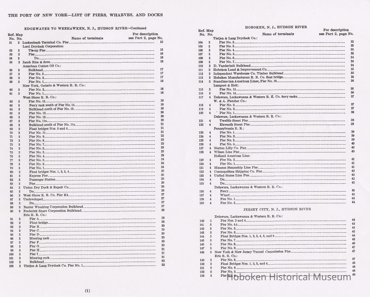 Notes: Full text of the reference leaf for 2011.005.0040. THE PORT OF NEW YORK-LIST OF PIERS, WHARVES, AND DOCKS EDGEWATER TO WEEHAWKEN, N. J., HUDSON RIVER-Continued Ref. No. Map No. Name of terminals For description see Part 2, page No. 51 2 Luckenbach Terminal Co. Pier 15 Lord Drydock Corporation: 52 2 Tie-up Pier 15 53 2 Pier 16 54 2 Do 16 55 2 Jacob Rice & Sons 16 American Cotton Oil Co.: 56 2 Bulkhead 17 57 2 Pier No. 3 17 58 3 Pier No. 2 17 59 3 Pier No. 1- 18 New York, Ontario & Western R. R. Co.: 60 3 Pier No. 2 18 61 3 Pier No. 1 18 West Shore R. R. Co.: 62 3 Pier No. 15 19 63 3 Ferry rack south of Pier No. 15 19 64 3 Bulkhead north of Pier No. 13 . 19 65 3 Pier No. 13 20 66 3 Pier No. 12 20 67 3 Pier No. 11a. 20 68 3 Bulkhead south of Pier No.11a 21 69 3 Float bridges Nos. 5 and 6 21 70 3 Pier No. 11 21 71 3 Pier No. 9 22 72 3 Pier No. 8 22 73 3 Pier No. 7 22 74 3 Pier No. 6 23 75 3 Pier No. 5 23 76 3 Pier No. 4 23 77 3 Pier No. 3 24 78 3 Pier No. 2 24 79 3 Pier No. 1 24 80 3 Float bridges Nos. 1,2,3,4 25 81 3 Express Pier 25 82 3 Passenger Station 25 83 3 Pier 26 84 3 Union Dry Dock & Repair Co. 26 85 3 Do 26 86 3 West Shore R. R. Co. Pier K4 27 87 3 Undeveloped 27 88 3 Do 27 89 3 Baxter Wrecking Corporation Bulkhead 27 90 3 Frederick Snare Corporation Bulkhead 28 Erie R. R. Co.: 91 3 Pier A . 28 92 3 Float bridge 28 93 3 Pier B 29 94 3 Pier C 29 95 3 Pier D 29 96 3 Mooring rack 30 97 3 Pier F. 30 98 3 Pier G 30 99 3 Pier H 31 100 3 Pier I 31 101 3 Mooring rack 31 102 3 Bulkhead 32 103 3 Tietjen & Lang Drydock Co. Pier No. 1 32 HOBOKEN, N. J., HUDSON RIVER Ref. No. Map No. Name of terminals For description see Part 2, page No. Tietjen & Lang Drydock Co.: 104 3 Pier No. 2 32 105 3 Pier No. 3. 33 106 3 Pier No. 4 33 107 3 Pier No. 5 33 108 3 Pier No. 6 34 109 3 Pier No. 7 34 110 3 D. Vanderbelt Bulkhead 34 111 3 Hoboken Land & Improvement Co 36 112 3 Independent Warehouse Co. Timber Bulkhead- 35 113 3 Hoboken Manufacturers R. R. Co. float bridge 35 114 3 Scandinavian American Liner, Pier No. 16 36 Lamport & Holt: 115 3 Pier No. 15. 36 116 3 Pier No. 14 36 117 4 Delaware, Lackawanna & Western R. it. Co. ferry racks 37 W. & A. Fletcher Co.: 118 4 Pier No. 3 37 119 4 Pier No. 2, 37 120 4 Pier No. 1 38 Delaware, Lackawanna & Western R. R. Co.: 121 4 Twelfth Street Pier . 38 122 4 Eleventh Street Pier 38 Pennsylvania R. R.: 123 4 Pier No. 1 39 124 4 Pier No. 2 39 125 4 Pier No. 3 39 126 4 Pier No. 4 40 127 4 Norton Lilly Co. Pier 40 128 4 Wilson Line Pier 40 Holland American Line: 129 4 Pier No. 2. 41 130 4 Pier No. 1 41 131 4 Munson Steamship Line Pier : 41 132 4 Cosmopolitan Shipping Co. Pier 42 133 4 United States Line Pier 42 134 4 Do 42 135 4 Do 43 Delaware, Lackawanna & Western R. R. Co.: 136 4 Ferry 43 137 4 Wharf 43 138 4 Pier No. 1 44 139 4 Pier No. 2 44 JERSEY CITY, N. J., HUDSON RIVER Delaware, Lackawanna & Western R. R. Co.: 140 5 Pier Nos. 3 and 4 | 44 141 5 Pier No. 4A 45 142 5 Pier No. 5 . 45 143 5 Pier No. 6 45 144 5 Float Bridges Nos. 1,2,3,4, 5, and 6 46 145 5 Pier No. 7. 46 146 5 Pier No. 8 46 147 5 Pier No. 9 47 148 5 New York & New Jersey Tunnel Commission Pier [Holland Tunnel] 47 Erie R. R. Co.: 149 5 Pier No. 8 47 150 5 Float Bridges Nos. 1,2,3, and 4 48 151 5 Pier No. 6 48 152 5 Pier No. 5. 48 153 5 Pier No. 4 49 Status: OK Status By: dw Status Date: 2011-04-04
