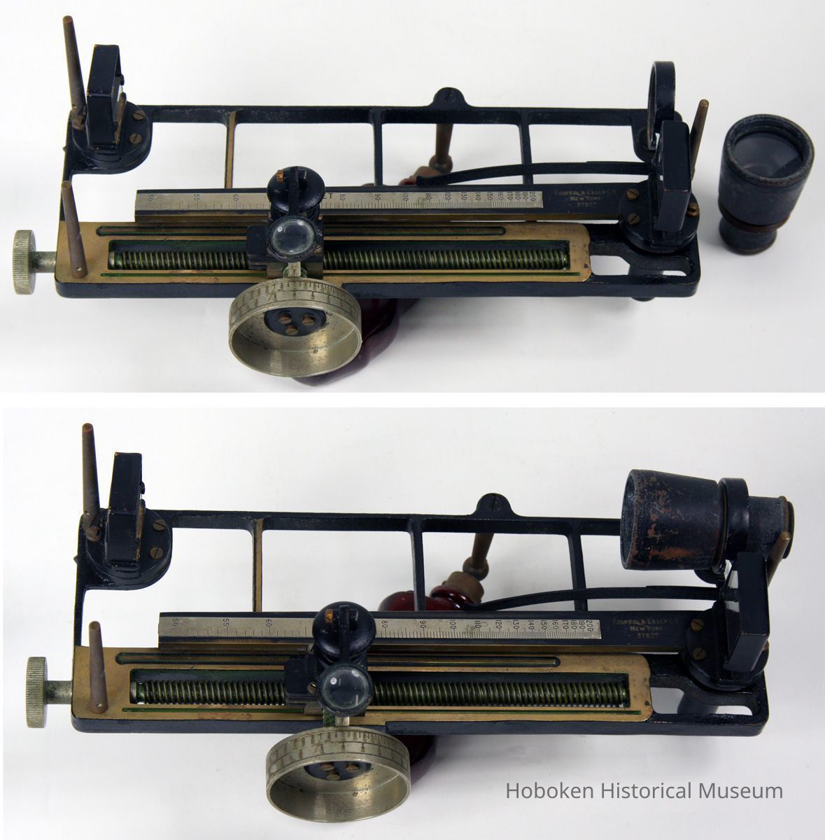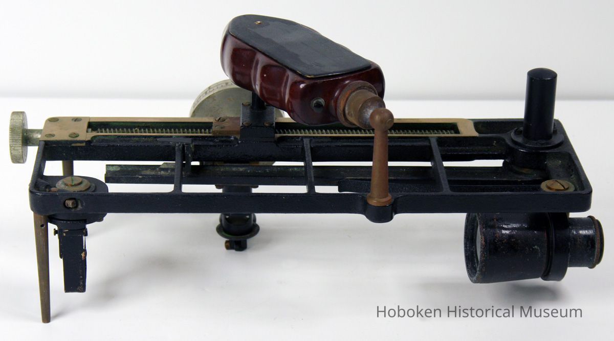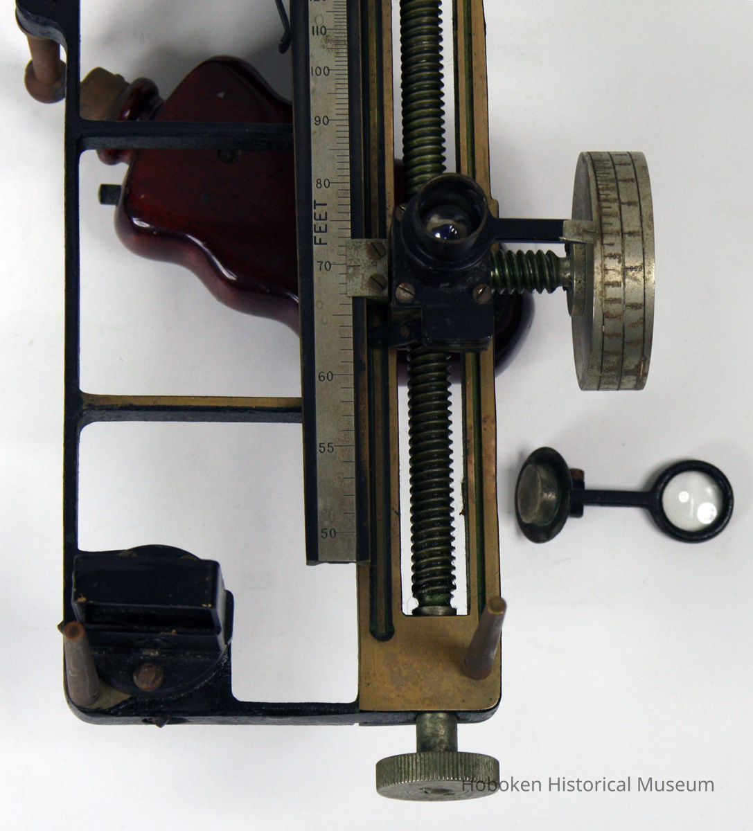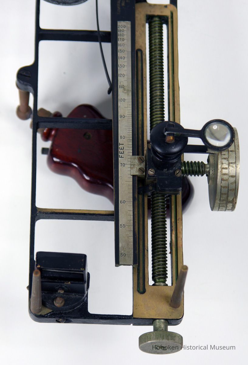 Notes: Description of the stadimeter from the website of the Smithsonian Institution, National Museum of American History, Behring Center, November 2009: The stadimeter is an optical rangefinder developed by Bradley Allen Fiske (1854-1942), an officer in the United States Navy. It was designed for gunnery purposes, but its first sea tests, conducted in 1895, showed that it was equally useful for fleet sailing and for navigation. The stadimeter uses a system of mirrors, as in a sextant, to bring two images into coincidence. In practice, a sailor would identify a distant ship, adjust the stadimeter for its mast-head height (a figure available in published accounts), bring the image of the mast-head into coincidence with the water line, and read the distance on the instrument’s drum. Stadimeters were widely used in World War I and again in World War II. Status: OK Status By: dw Status Date: 2009-11-09