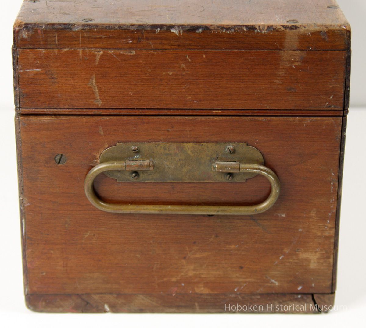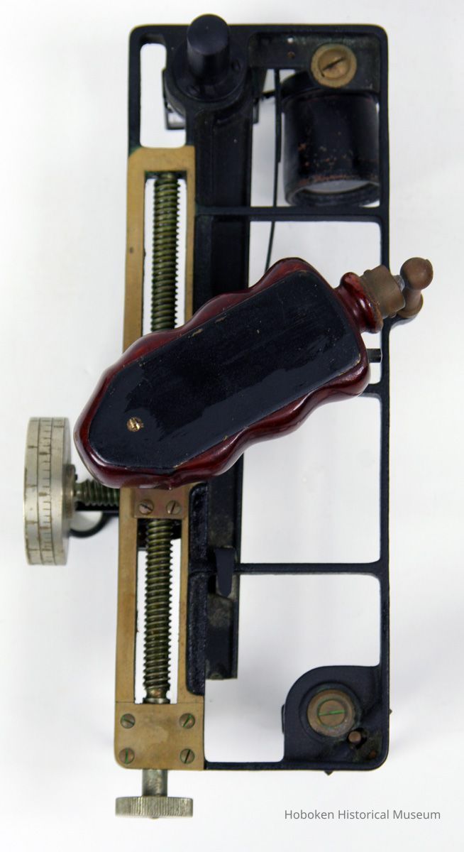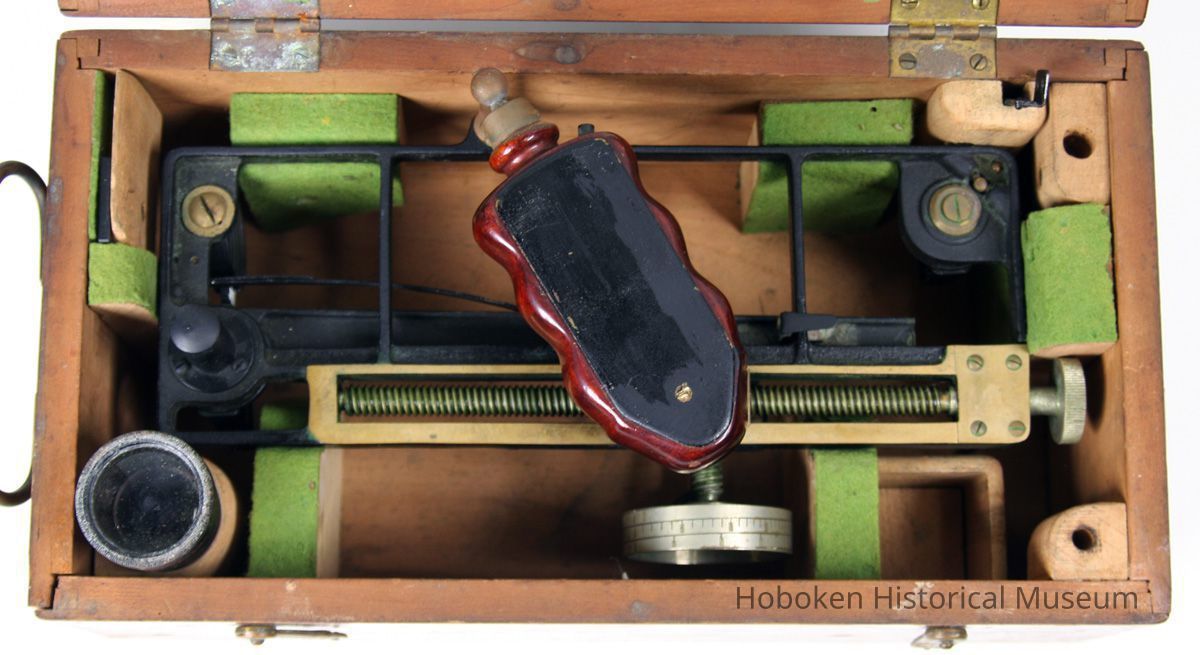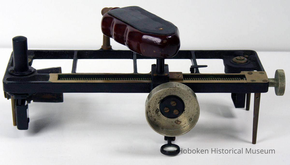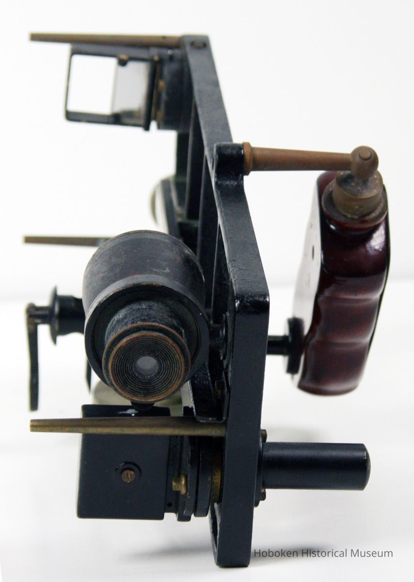 Notes: Description of the stadimeter from the website of the Smithsonian Institution, National Museum of American History, Behring Center, November 2009: The stadimeter is an optical rangefinder developed by Bradley Allen Fiske (1854-1942), an officer in the United States Navy. It was designed for gunnery purposes, but its first sea tests, conducted in 1895, showed that it was equally useful for fleet sailing and for navigation. The stadimeter uses a system of mirrors, as in a sextant, to bring two images into coincidence. In practice, a sailor would identify a distant ship, adjust the stadimeter for its mast-head height (a figure available in published accounts), bring the image of the mast-head into coincidence with the water line, and read the distance on the instrument’s drum. Stadimeters were widely used in World War I and again in World War II. Status: OK Status By: dw Status Date: 2009-11-09