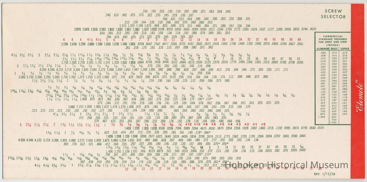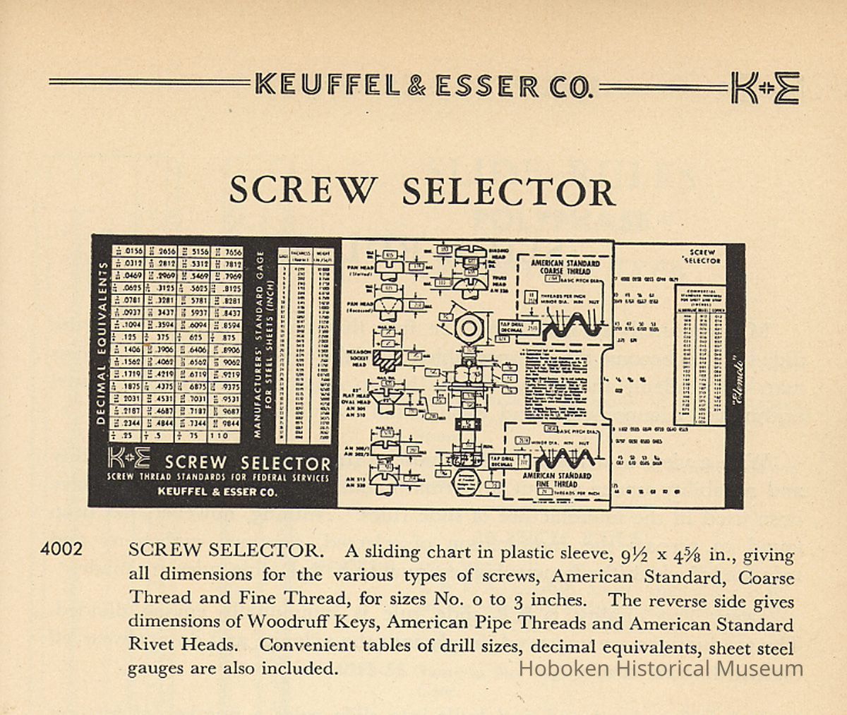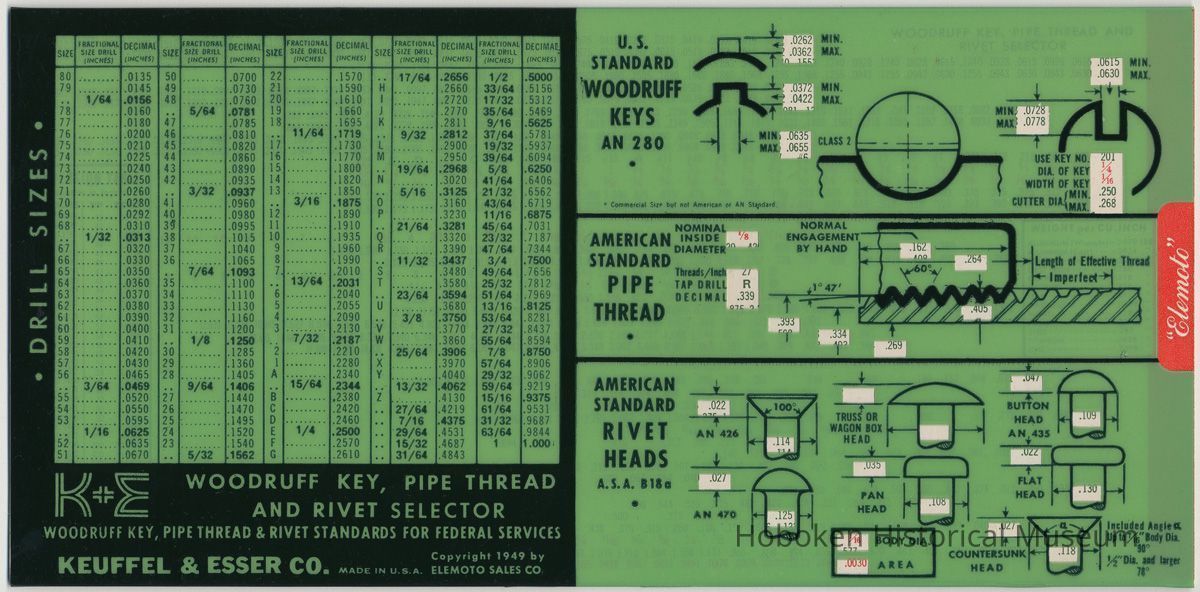 K&E Screw Selector. [Product number 4002] Screw Thread Standards for Federal Services; K&E Woodruff Key, Pipe Thread and Rivet Selector; Woodruff Key, Pipe Thread & Rivet Standards for Federal Services. Keuffel & Esser Co., Made in U.S.A. Copyright 1949 by Elemoto Sales Co.; revised Jan. 15, 1958. Plastic sleeve printed internally with multiple die-cut windows; printed cardstock slide. 4-11/16" high x 9-1/2" long. Made by Whitehead-Hoag, Newark, N.J.
