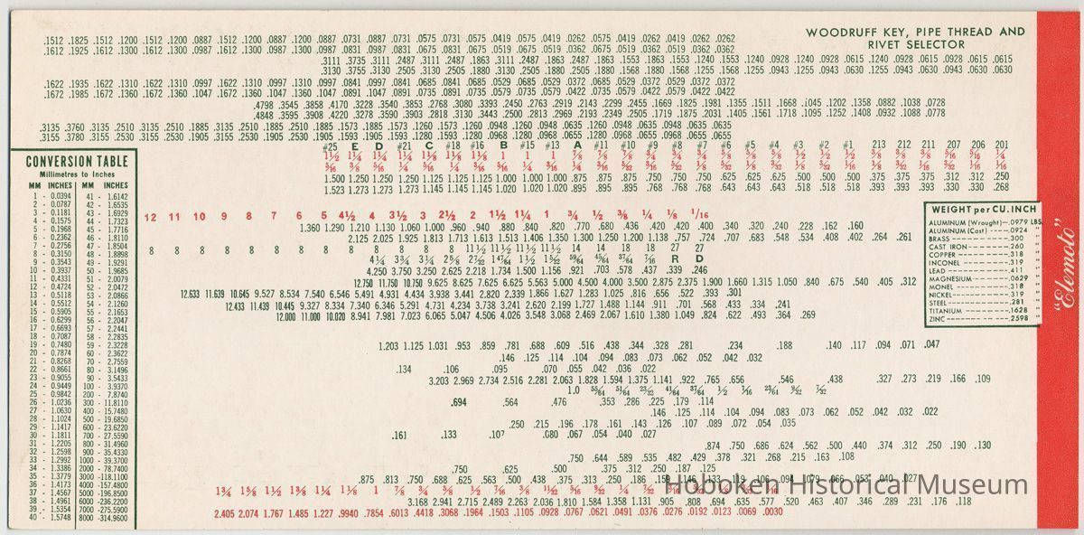 Screw Selector on one side and inverts for tables on the reverse regarding Drill Sizes, U.S. Standard Woodruff Keys, American Standard Pipe Thread, American Standard Rivet Heads. Slide has the revision date and has additional tables printed on it.