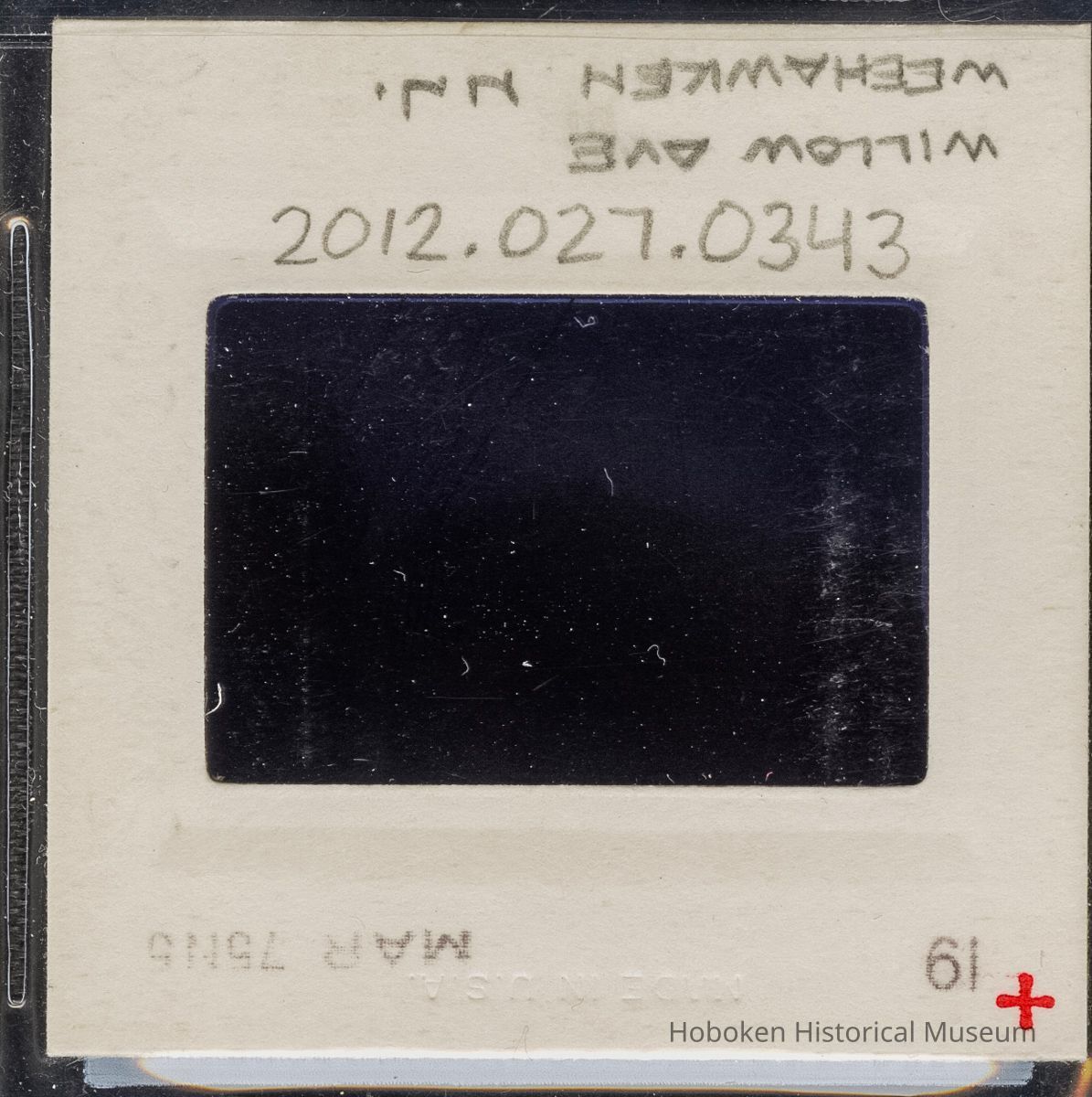 Color slide of detail view of pediment, cornice, brackets, frieze reading "BALDWIN HOSE CO" and semicircular arches at 1818 Willow in Weehawken