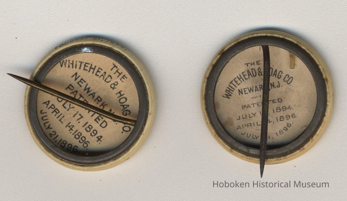 The back label of Whitehead & Hoag Co., Newark, N.J., who was the maker of the buttons, is slightly different on each one. The text on each one is in a different point size and weight; they both have the same text including 3 patent dates with the latest being July 21, 1896.