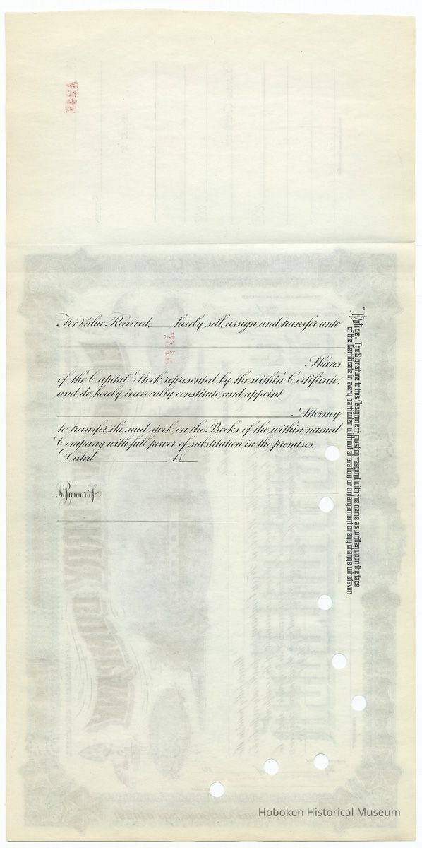 Stock certificate of the Hoboken Ferry Company, No. A247, unregistered, canceled, from the 1890's. 7-1/4" high x 14-3/4" long with left fold-out; certificate only is 10-5/8" wide. No signatures or corporate seal.