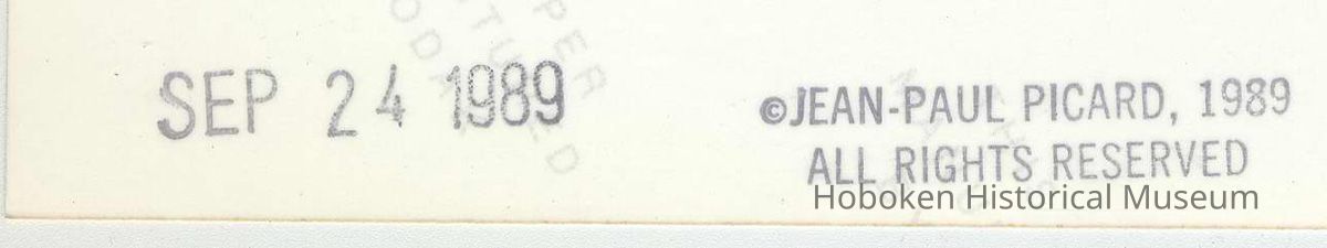 Color photo of Castle Point, taken from below on River St.(Sinatra Drive) near the Hudson River, Hoboken, September 24, 1989. 4" x 5-3/4" wide print. Reverse has photographer's copyright stamp and a date stamp. Photograph by Jean-Paul Picard.