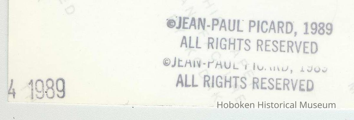 Color photo of Hudson United Bank, corner of Hudson & Newark Sts., Hoboken, September 24, 1989. 3-3/4" x 4" wide print. Reverse has photographer's copyright stamp and a date stamp. Photograph by Jean-Paul Picard.