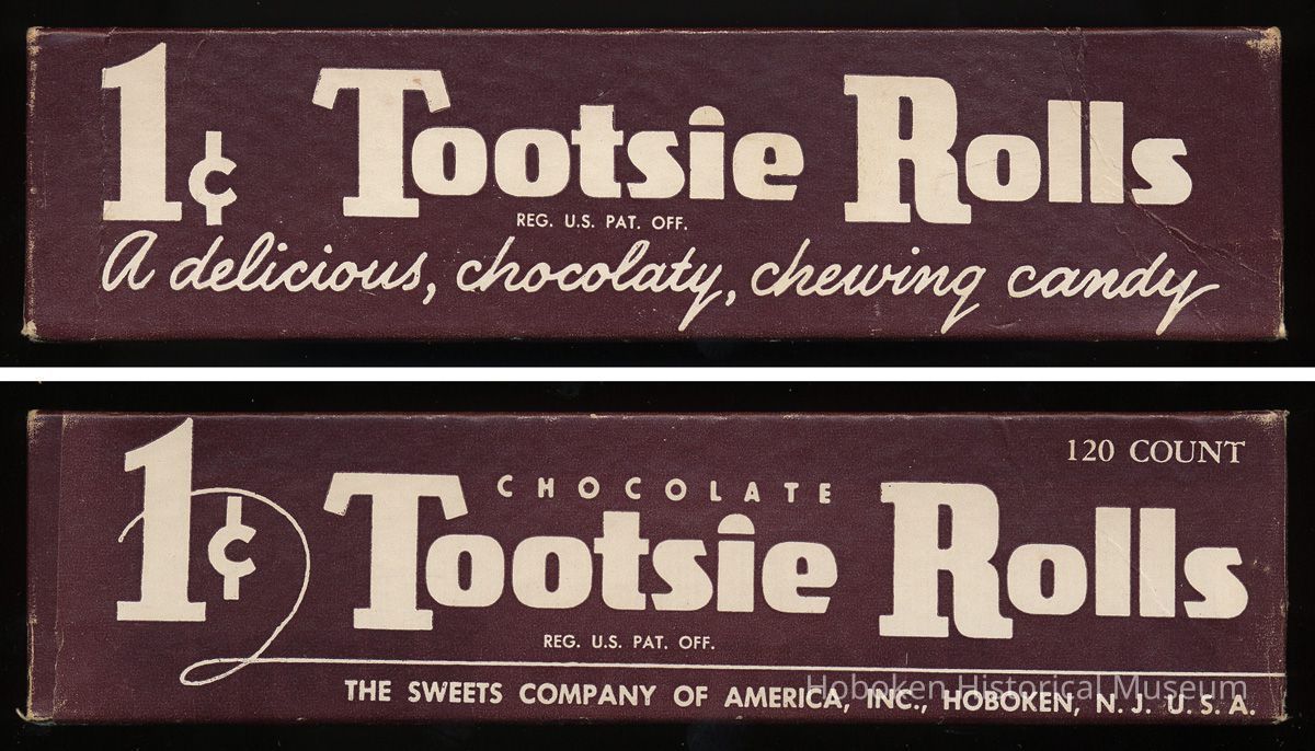 Box: Tootsie Rolls, 120 count, retailer package. Made by Sweets Co. of America, Hoboken, N.J., n.d., ca. 1940-1950.