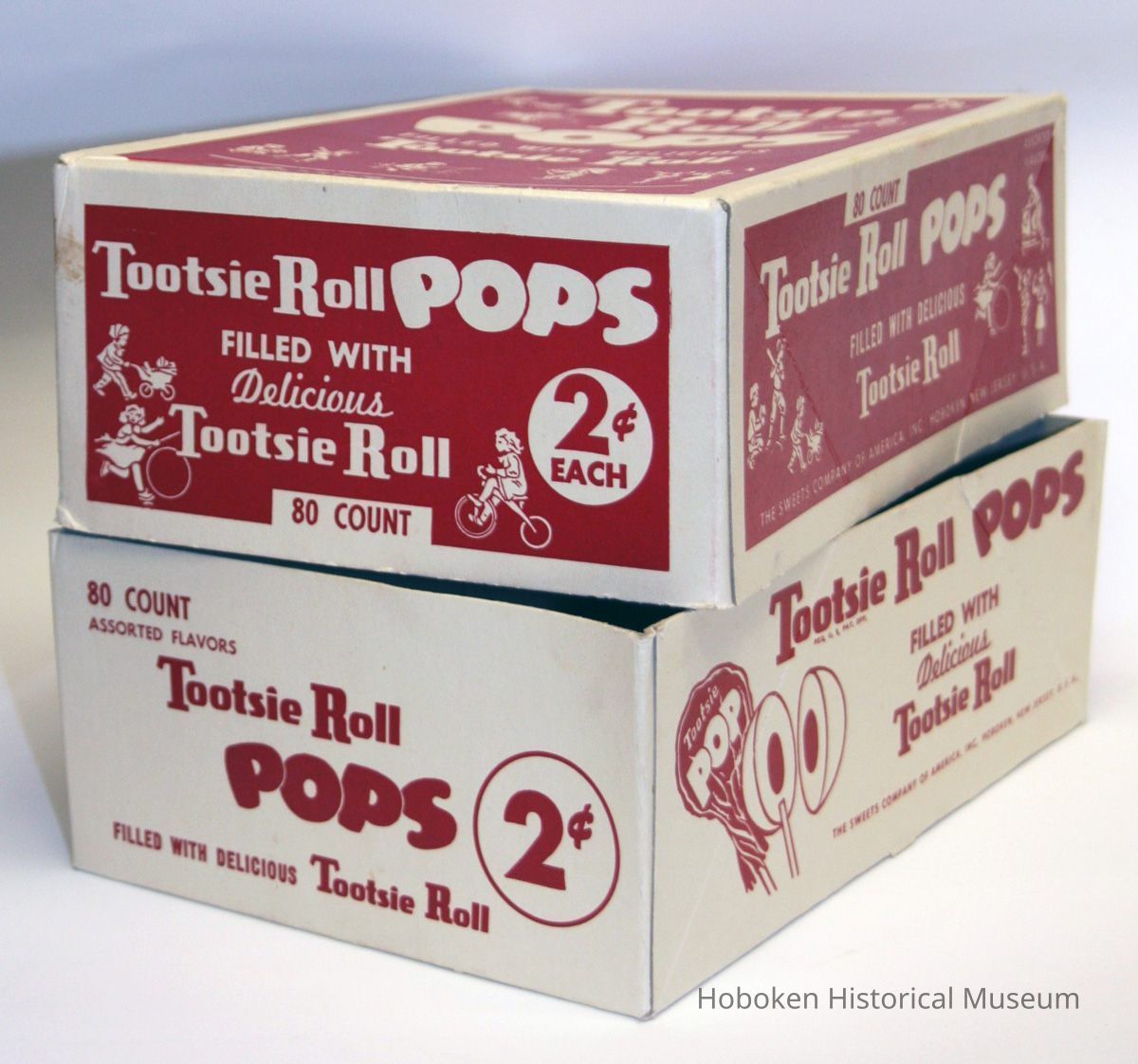 Tootsie Roll Pops; Filled with Delicious Tootsie Roll; Assorted Flavors; 2 cents each; 80 count. Retailer packaging. Issued by Sweets Company of America, Hoboken, N.J., no date, circa 1940-1950. Two piece box, card stock, printed in red ink, 3-7/8" high x 7-3/8" wide x 10-1/4" deep.