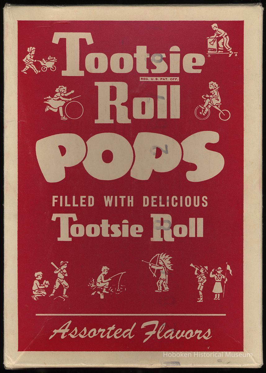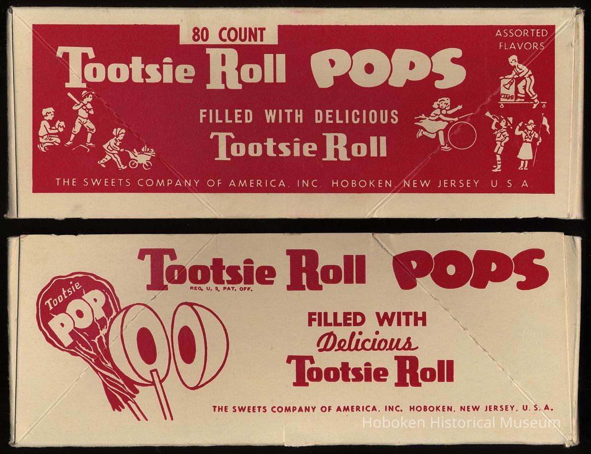 Box: Tootsie Roll Pops, 80 count, retailer package. Made by Sweets Co. of America, Hoboken, N.J., n.d., ca. 1940-1950.