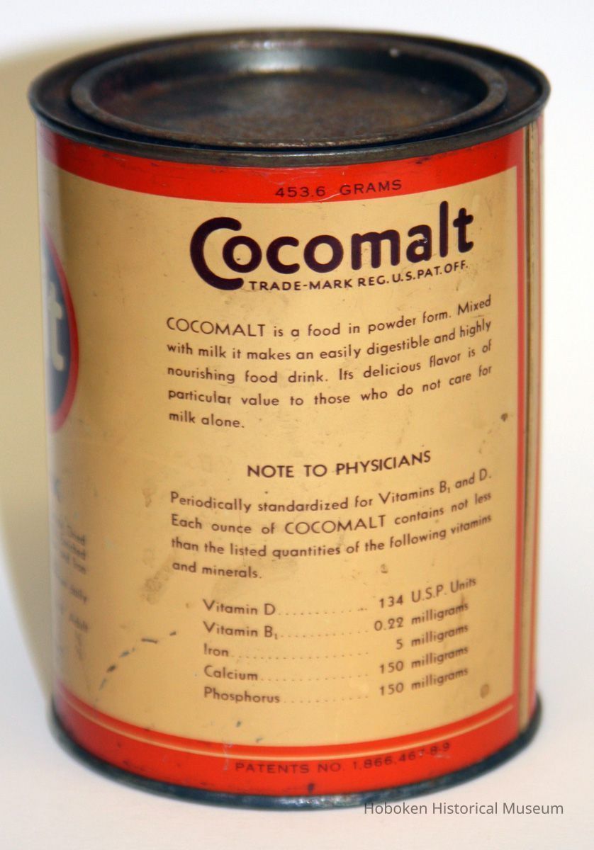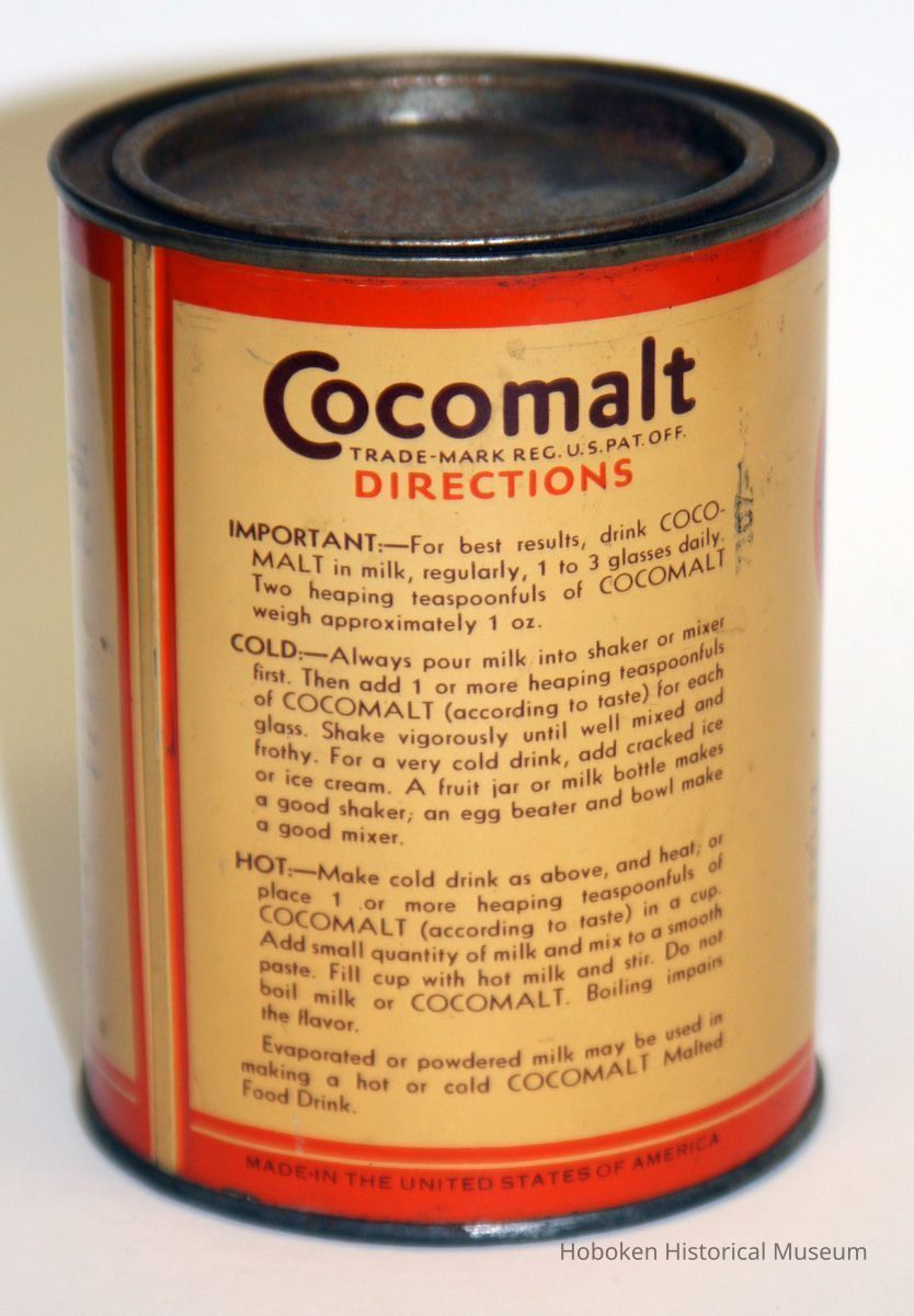 Cocomalt. Malted Food Drink. 1 Pound Net. Made by the R.B. Davis, Company, Hoboken, N.J. No date, circa 1930-1940. Printed (lithographed tin) metal can with removable pry lid, 3-3/4" diameter x 4-7/8" high. Inner seal previously removed with perimeter remnants; the bulk of original powder contents still present. Inkstamp on left side of can "7017" which is presumably a lot or batch number. Bottom of can embossed: C7
