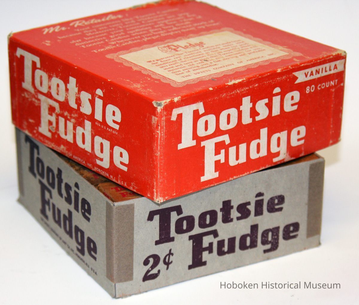 Tootsie Fudge, Vanilla, 80 count. Made by The Sweets Company of America, Hoboken, N.J., no date, circa 1953-1960. Two -piece cardboard box with printed paper covered lid, 6" wide x 6-1/4" deep x 2-3/8" high. Original contents present.