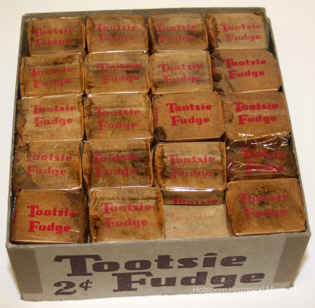 Box tray is imprinted on all 4 side panels: Tootsie Fudge 2¢. Company name and location is only printed on the two longer sides. Tray was intended for counter or case display.
