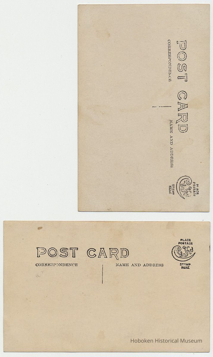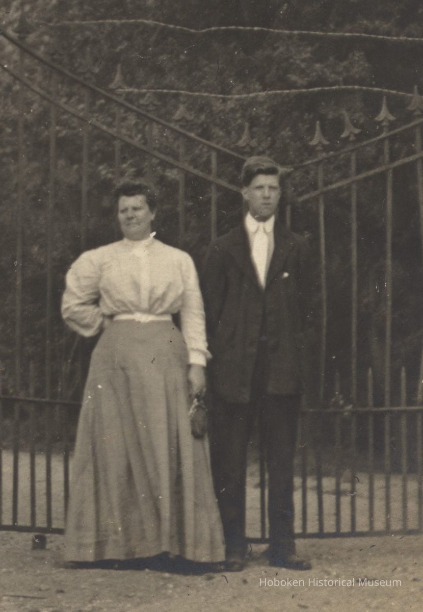 Postcards, two: [Woman and young man standing outside gate at the Stevens Gatehouse at Sixth Street , Hoboken.] No dates, circa 1907-1918. Real photo postcards 3-1/2" x 5-1/2"; divided back; Cyko paper stamp block; unused / unposted.