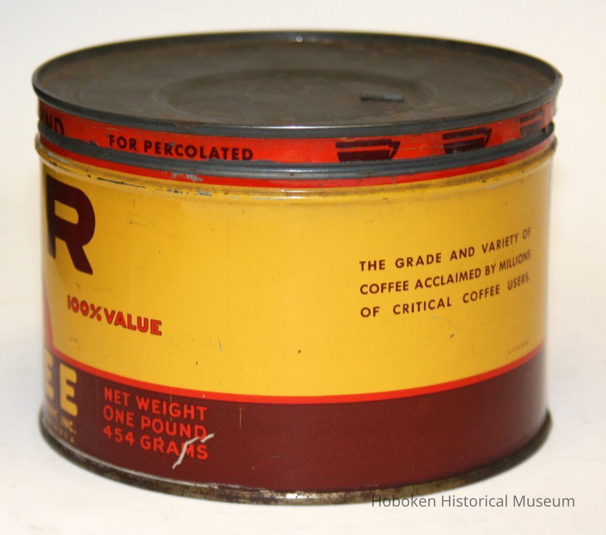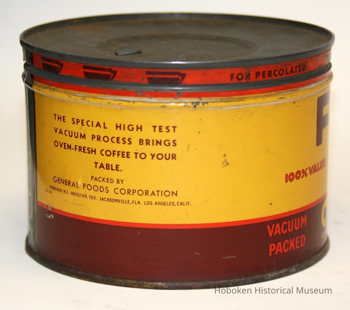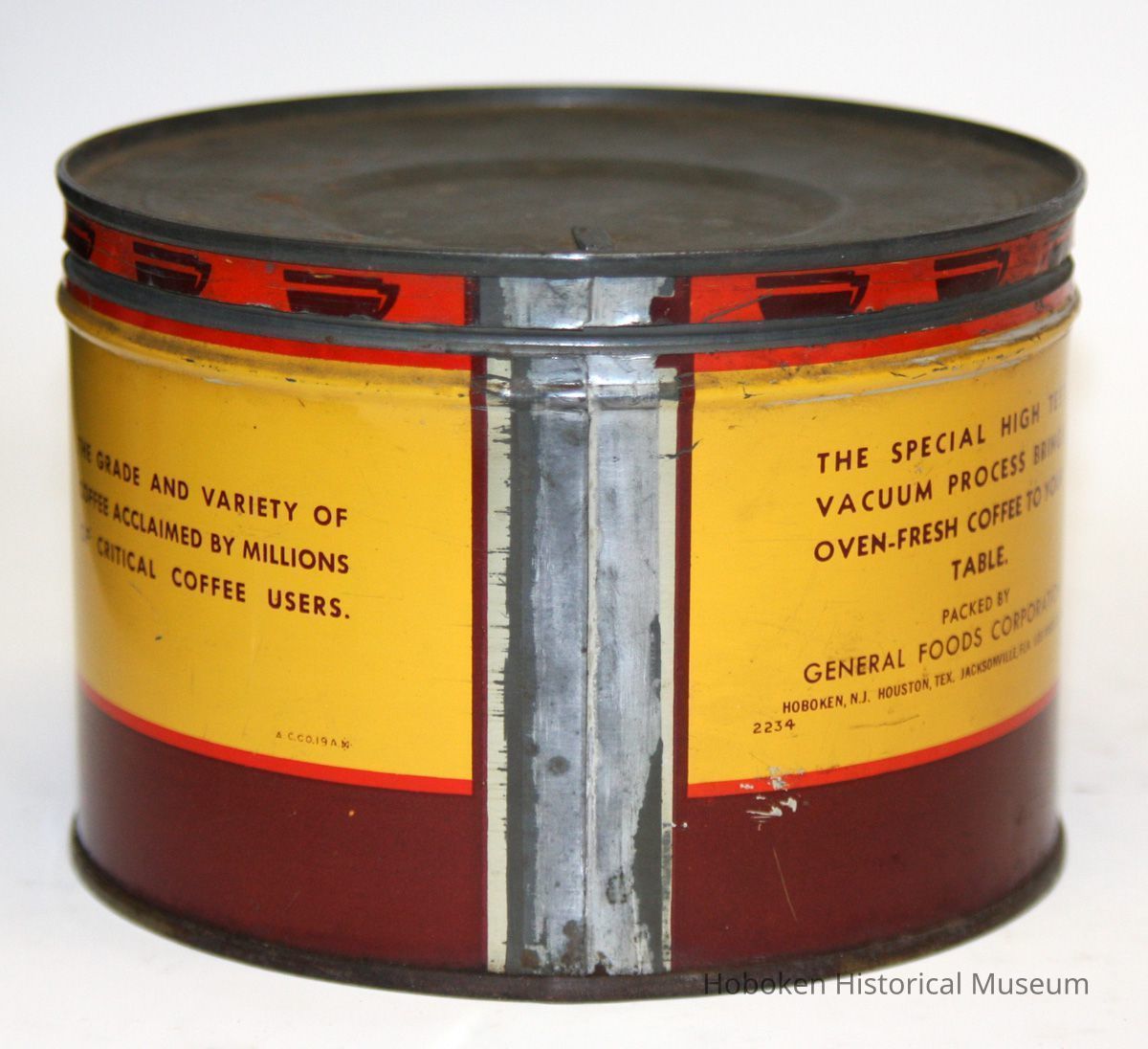 Notes: This brand was established before General Foods built the Hoboken Maxwell House Coffee plant that opened in late 1939. With the Hoboken name on it, the earliest date would be 1939 and from the style of the graphics, probably not later that about 1950. It is not known if this can itself was packed in Hoboken or if this brand every was made in Hoboken (may have only been for regional distribution outside of the Northeast and produced at one of the other plants; possibly for export market.) Considering World War II and metal restrictions for packaging, its date of production may have been more restricted. In reference to the catalogue, it may also be considered as part of: Maxwell House Coffee, Hoboken Division, Collection Status: OK Status By: dw Status Date: 2010-09-27