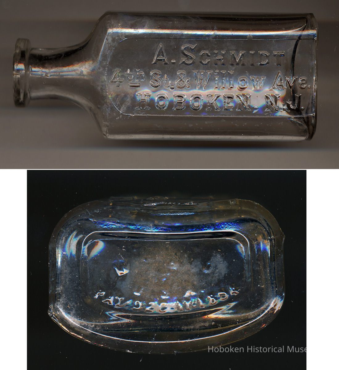 Bottle: A. Schmidt, 4th St. & Willow Ave., Hoboken, N.J. No date, circa 1894-1901. Clear mold blown glass, flat top, 4" high x 1-11/16" wide x 1" deep. Raised lettering in flat field. Maker's mark on base as noted below. Original contents not known.