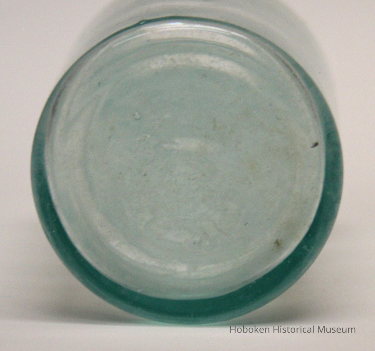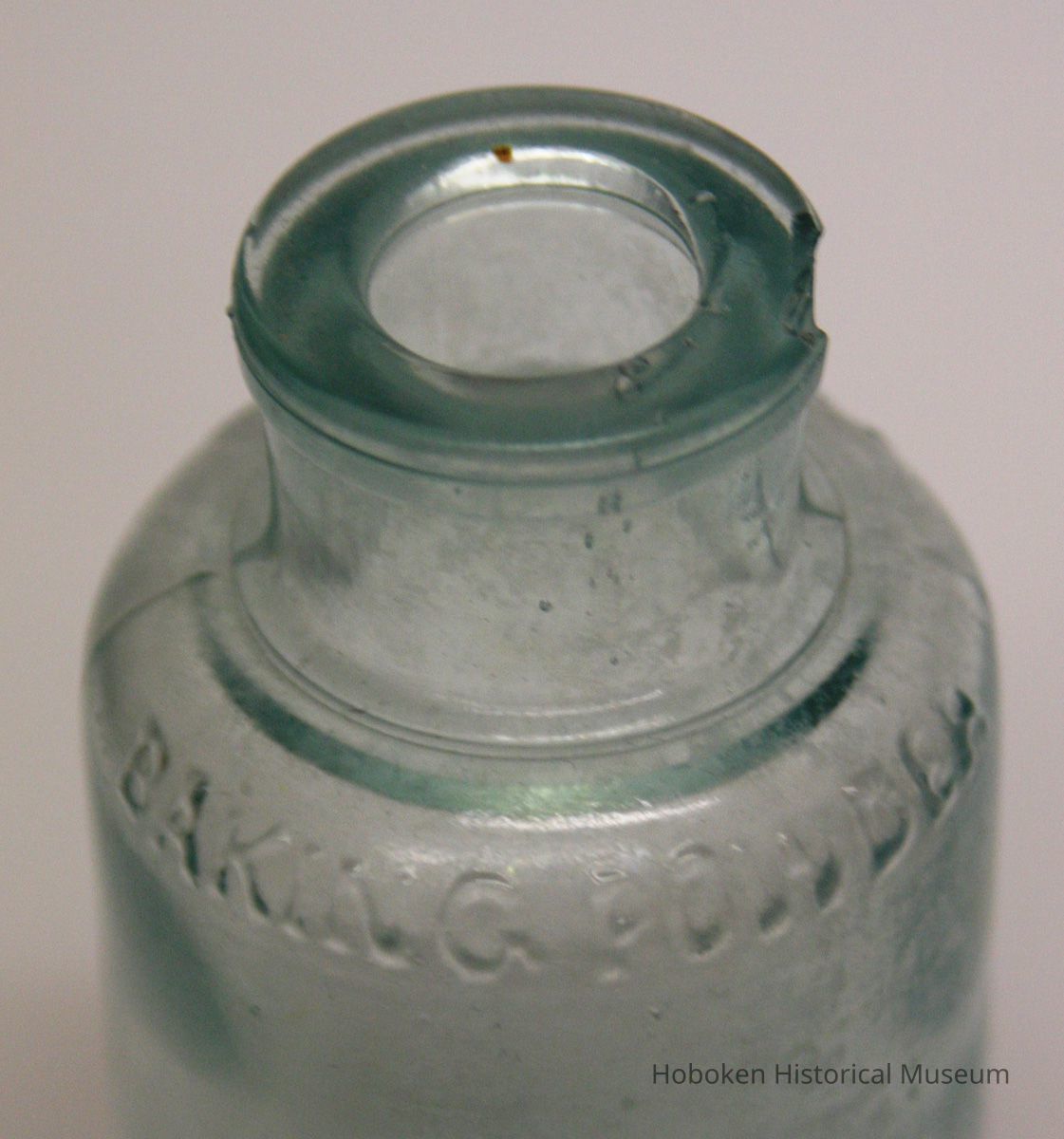 Davis OK Baking Powder. Product made by R. B. Davis Co., Hoboken, no date, circa 1890-1910. Greenish tint clear molded glass, 2-1/4" diameter x 4-3/8" high; 3/4" diameter bore; embossed lettering on shoulder; flanged lip, wide rim; mold seams slightly raised. No maker's marks on base.