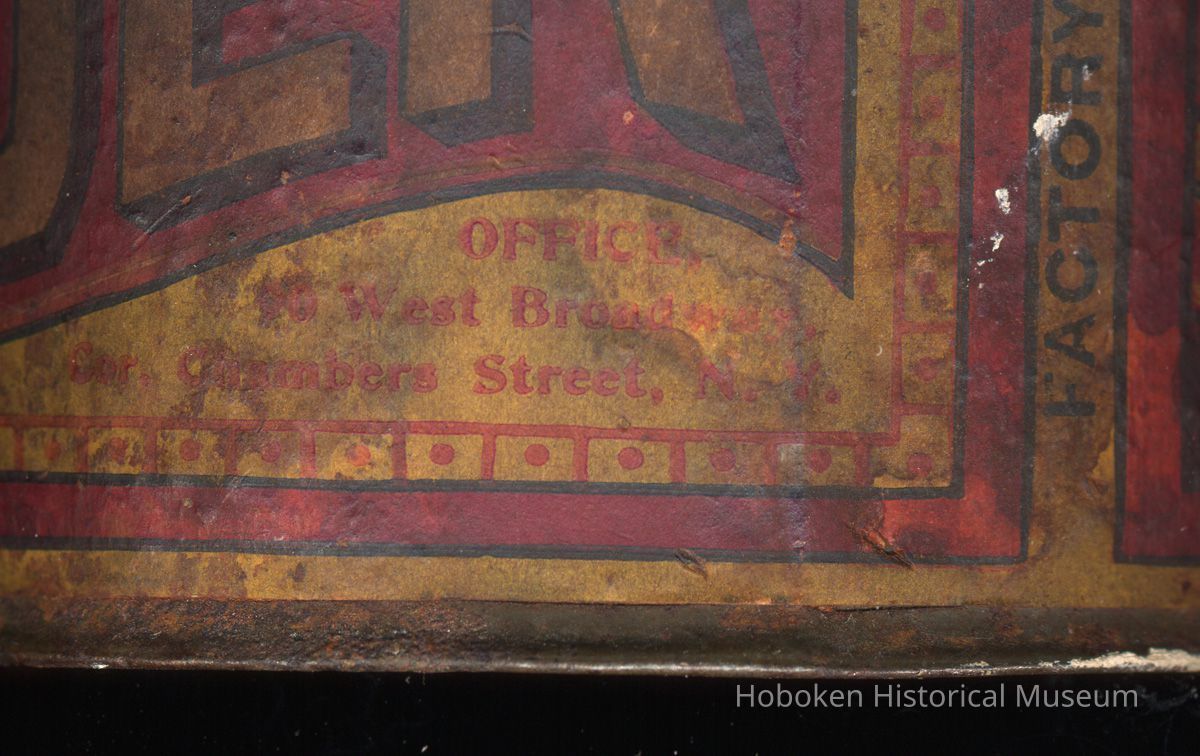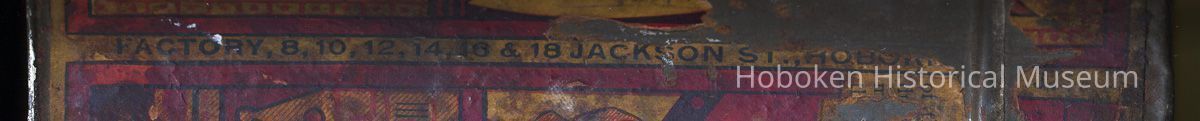 On left side running vertically is the Hoboken address: Factory, 8, 10, 12, 14, 16 & 18 Jackson St., Hobok[en, N.]J.