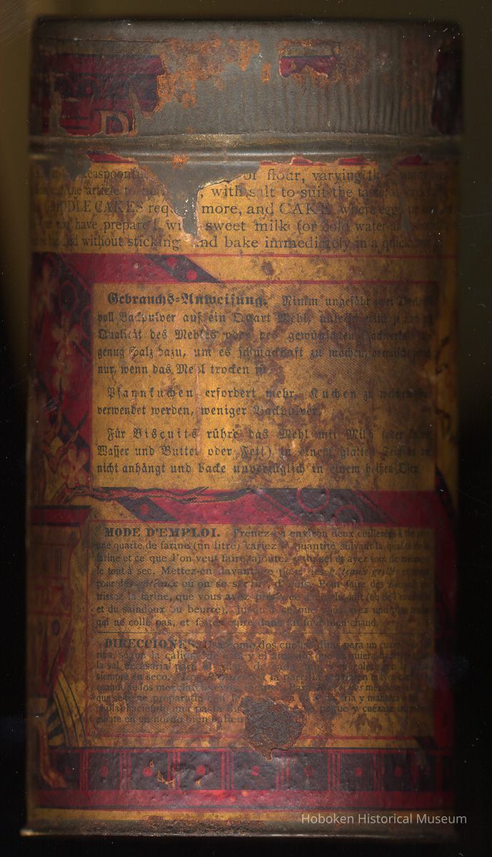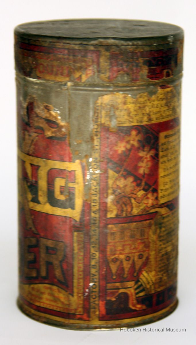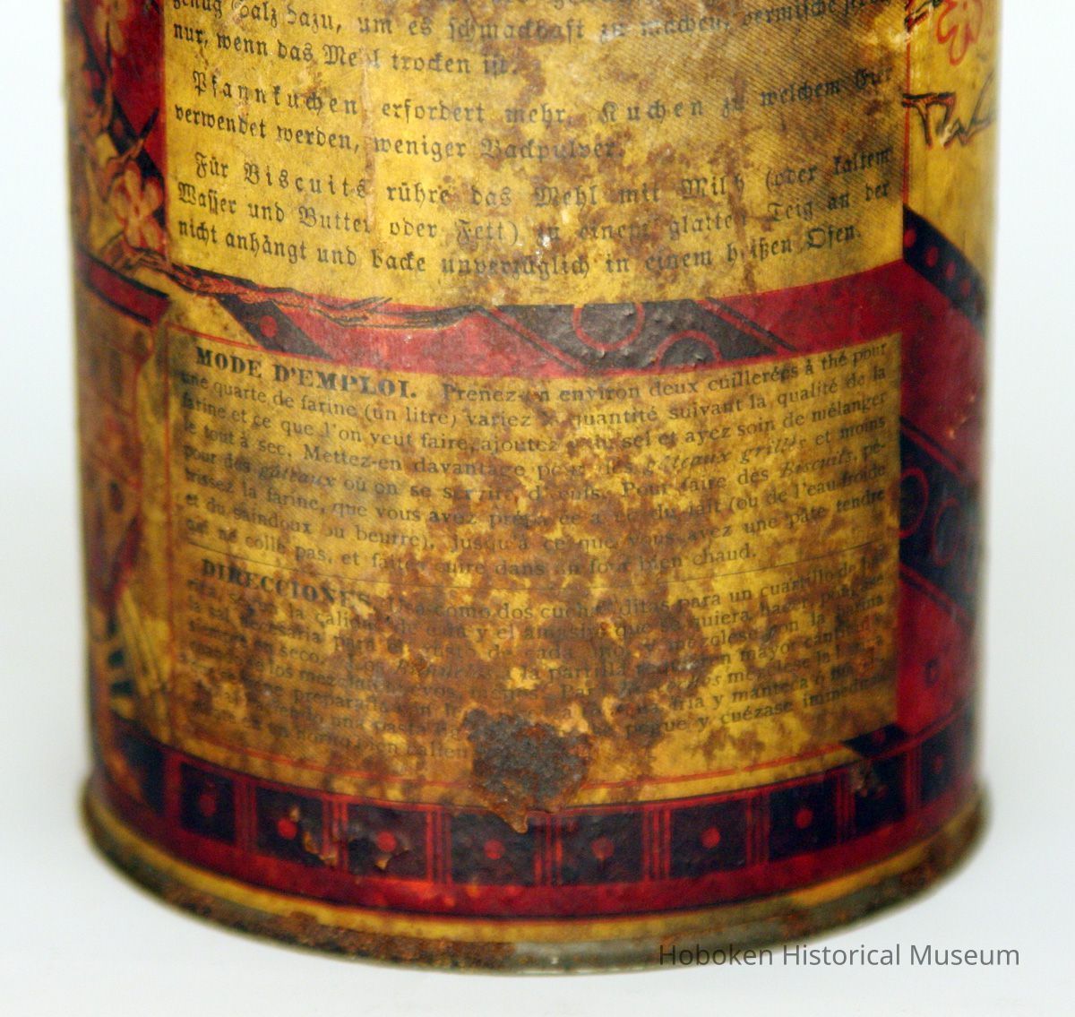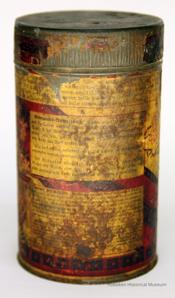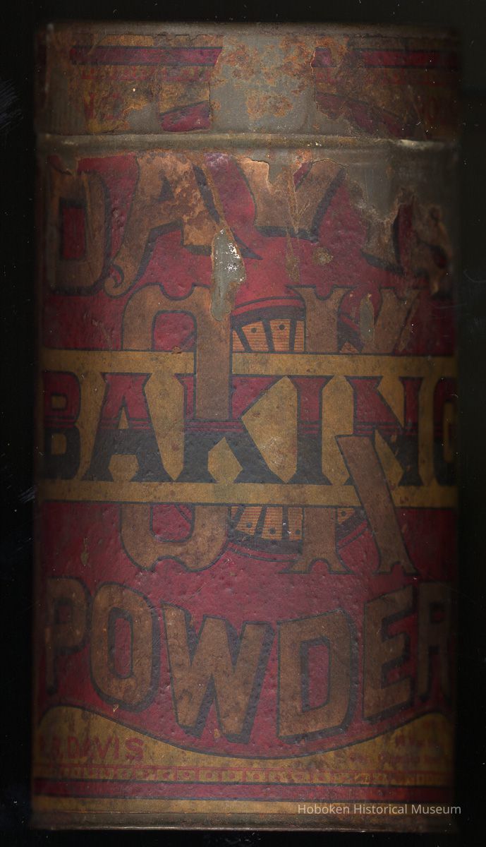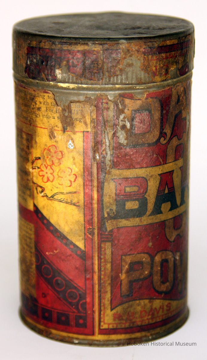 Davis OK Baking Powder. One pound can. Export packaging? R. B. Davis Company, New York; Factory in Hoboken, no date, circa 1899-1910. Metal can with slip lid, 3/3/16" diameter x 5-3/8" high. Original printed paper label, full height, present; darkened and worn with some losses mostly at the top. Container holds ca. a half-teaspoon of whitish powder; not analyzed and unknown if baking powder; not considered at this time as original contents.
