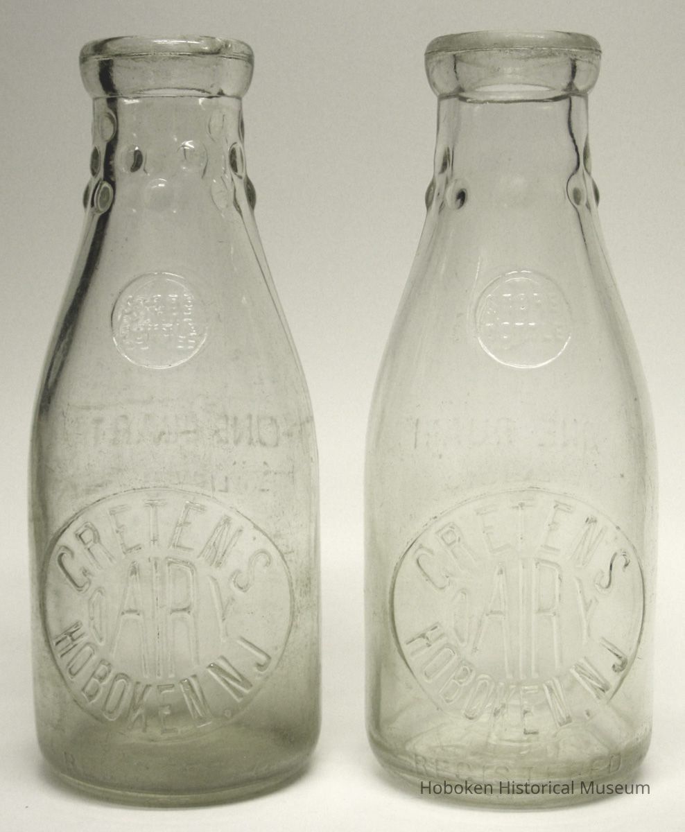 Greten's Dairy, Hoboken, N.J. One Quart Store Bottle. Five cent deposit. No date, circa 1930s. Clear glass with embossed lettering, hobnail grip neck; 4-3/4" diameter x 9-9/16" high. Two each.