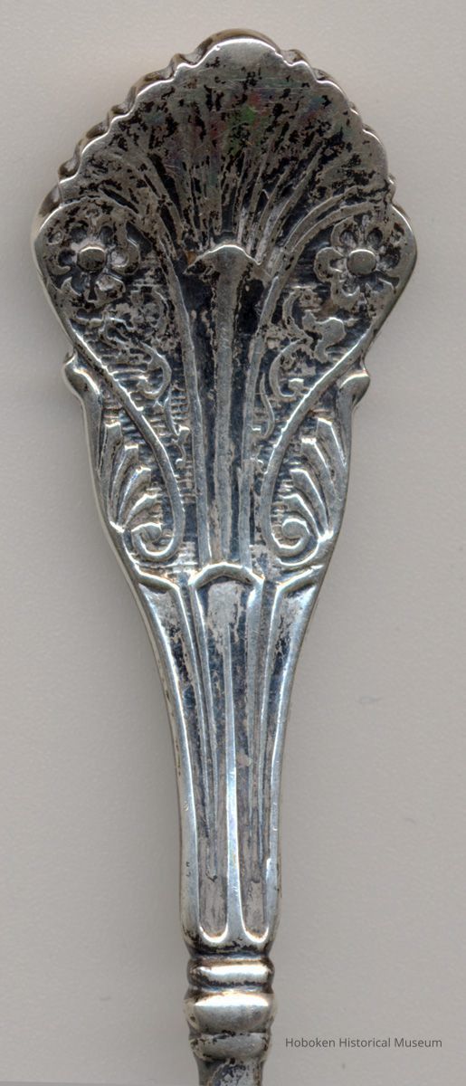 See 2001.110.0003 for another souvenir spoon depicting Trinity Church, Hoboken made by the same company. It is a different pattern plus the engraved image and titling is significantly different. Stylistically that one appears to be earlier than the pattern seen here and has been given an estimaged date range of 1890-1900.