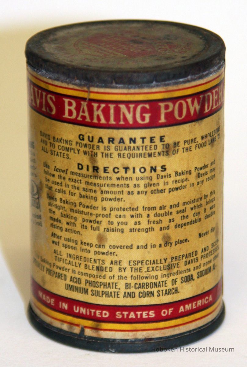 Davis OK Baking Powder. 3 ounce can. R. B. Davis Company, Hoboken, N.J., no date, circa 1931-1936. Metal can with twist slip lid, 2" diameter x 2-13/16" high; printed paper full-height wrap-around label; lid top printed decal. Bottom has embossed ring with "1 5" embossed at center. All text in English. Inner seal removed except for remains at edge indicatint it was a paper not metal seal. A slight amount of what appears to be original contents present; not verified.