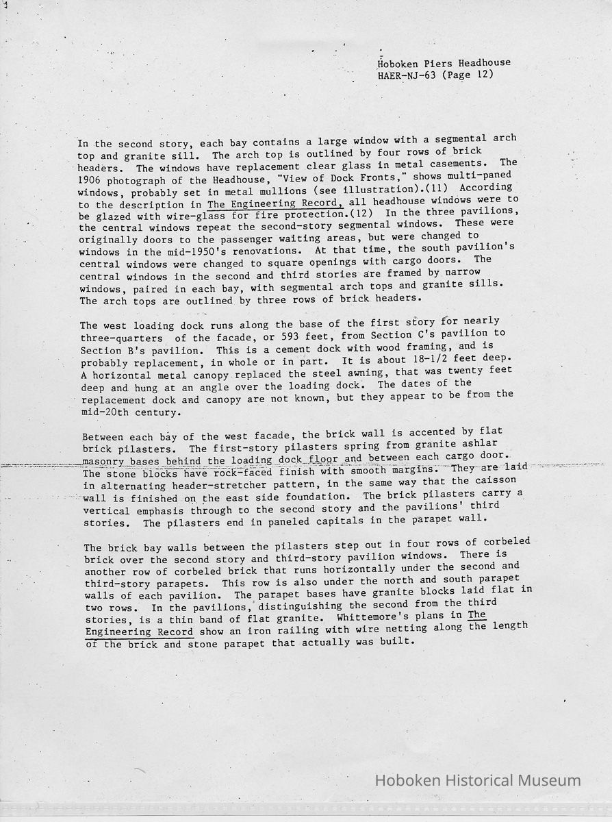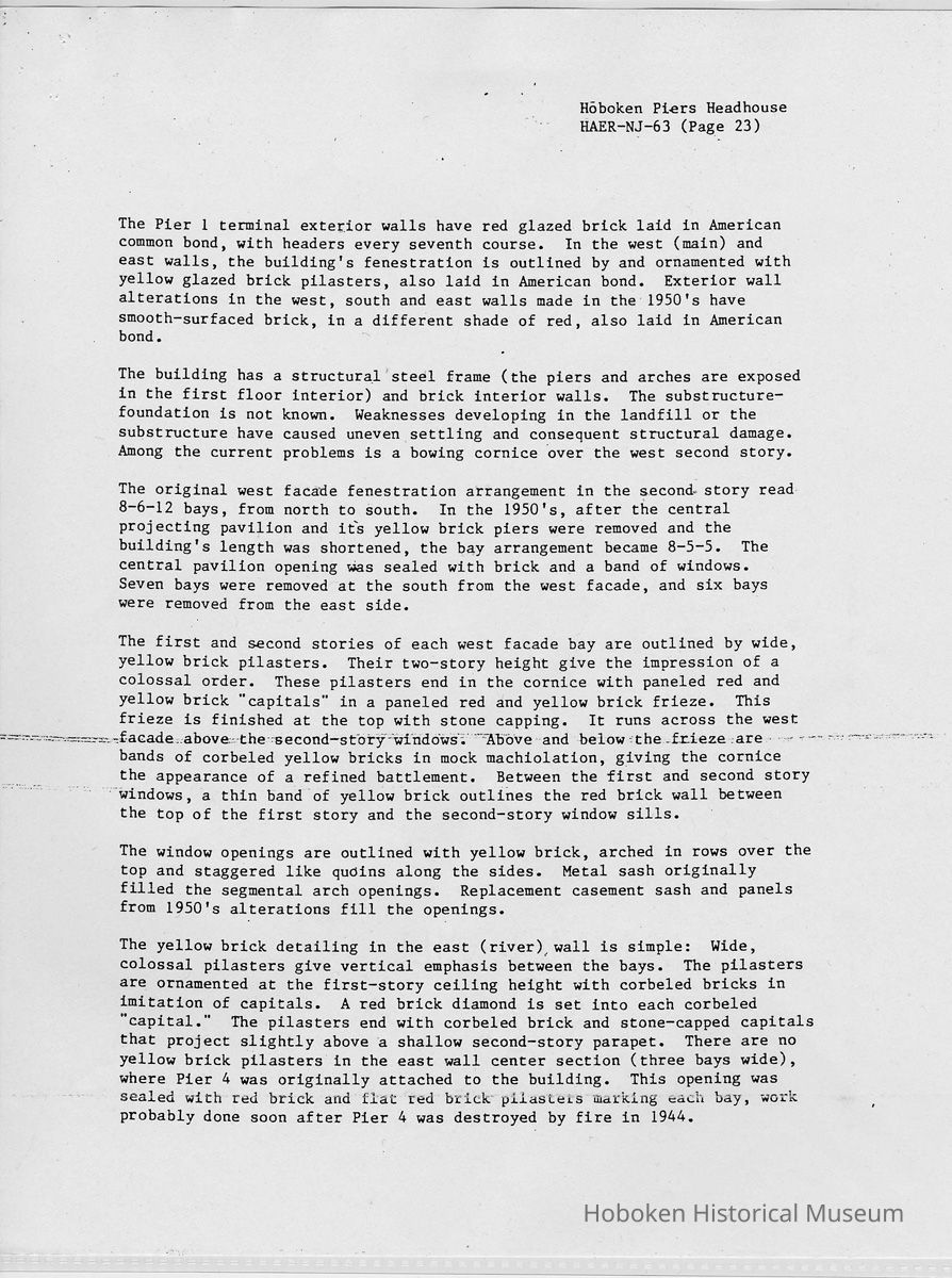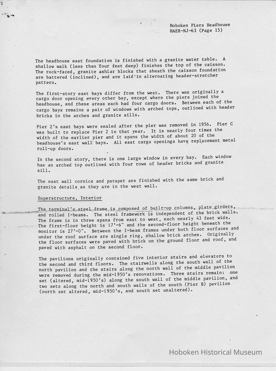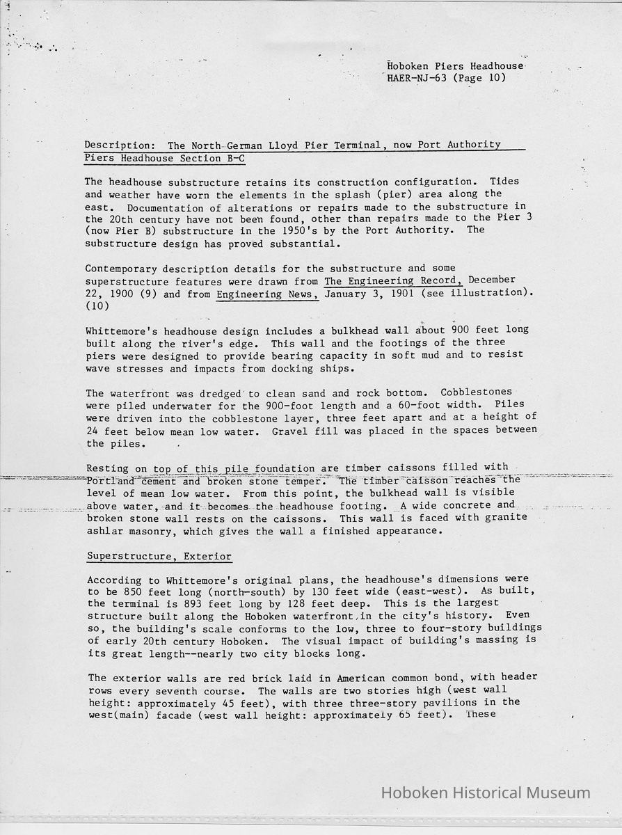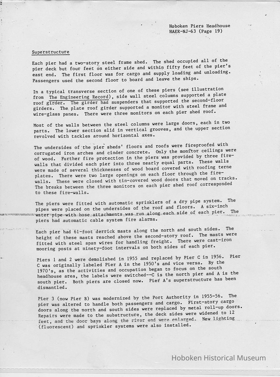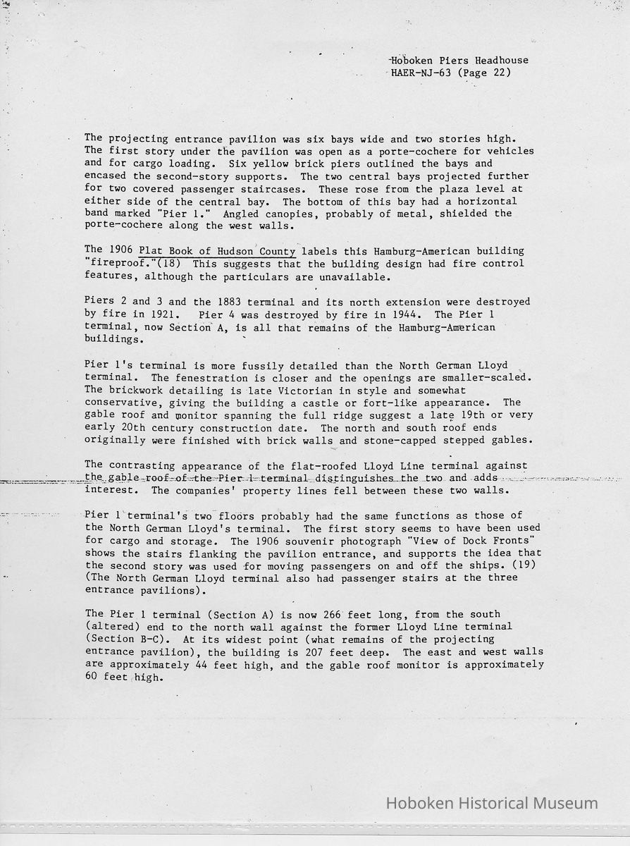 Report: Historic American Engineering Record: Hoboken Piers Headhouse. HAER - NJ - 63. Ca. 1986.