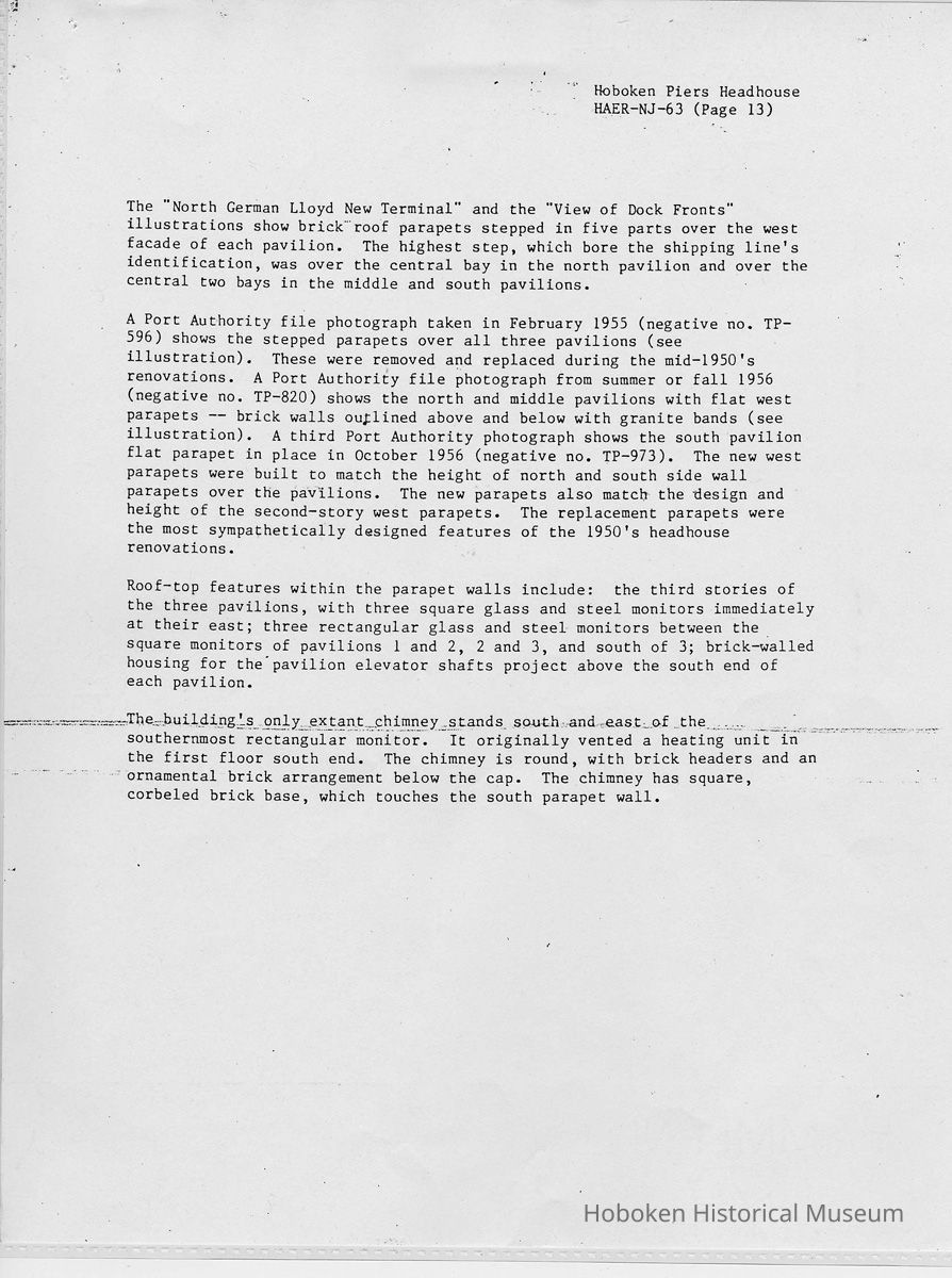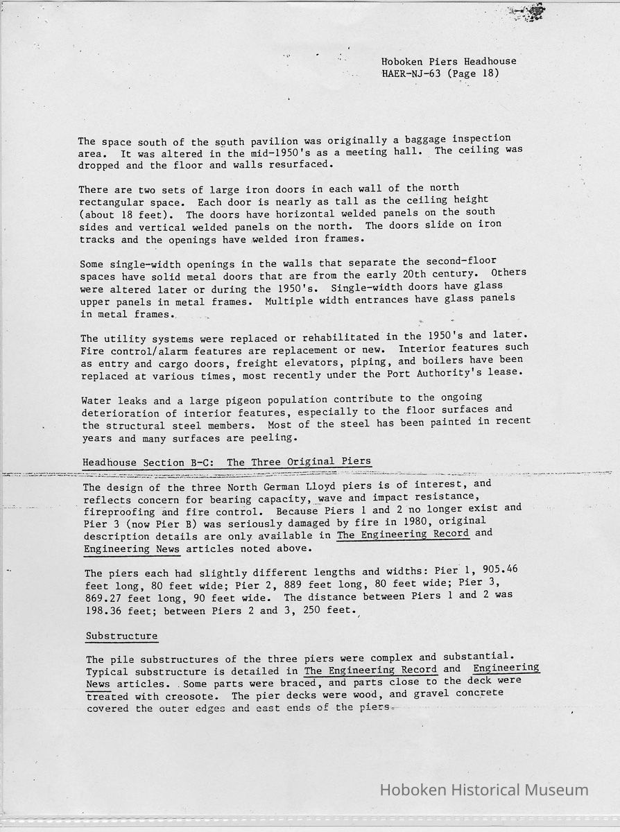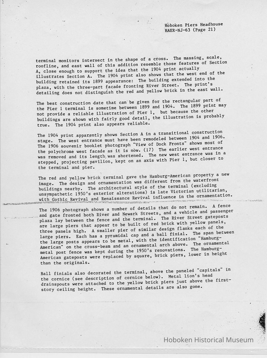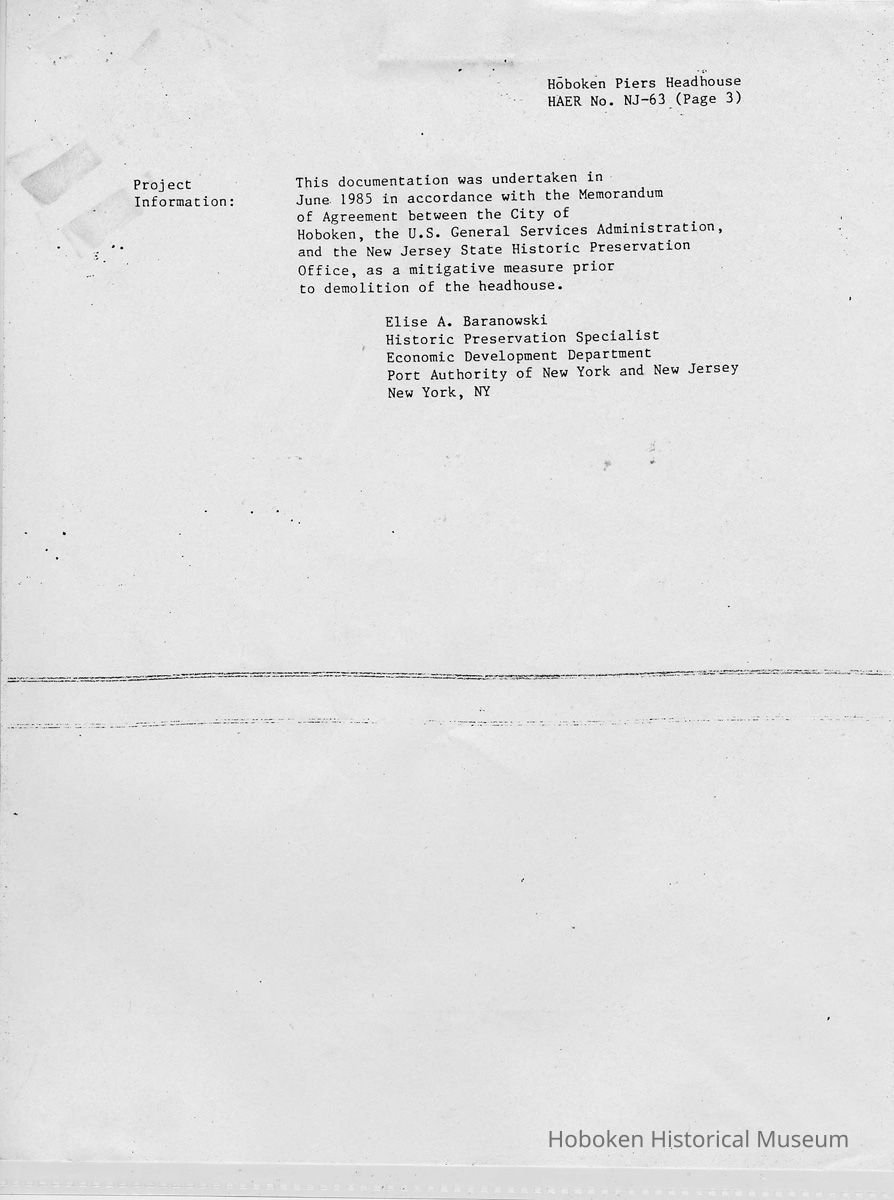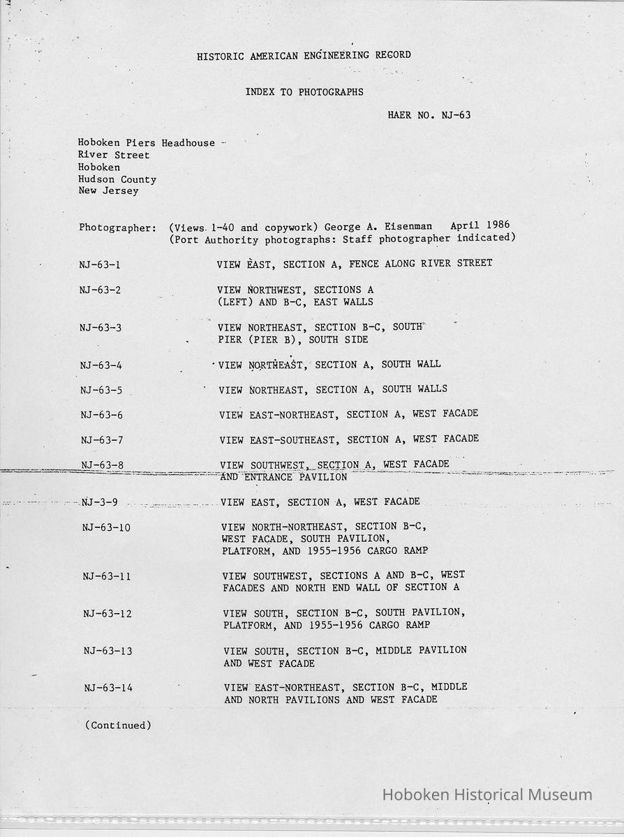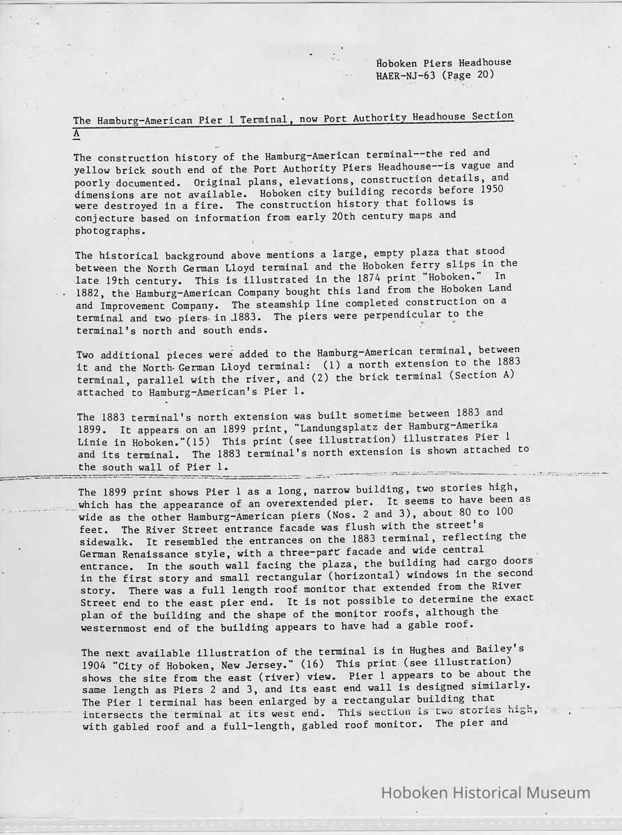 Report: Historic American Engineering Record: Hoboken Piers Headhouse. HAER - NJ - 63. Ca. 1986.