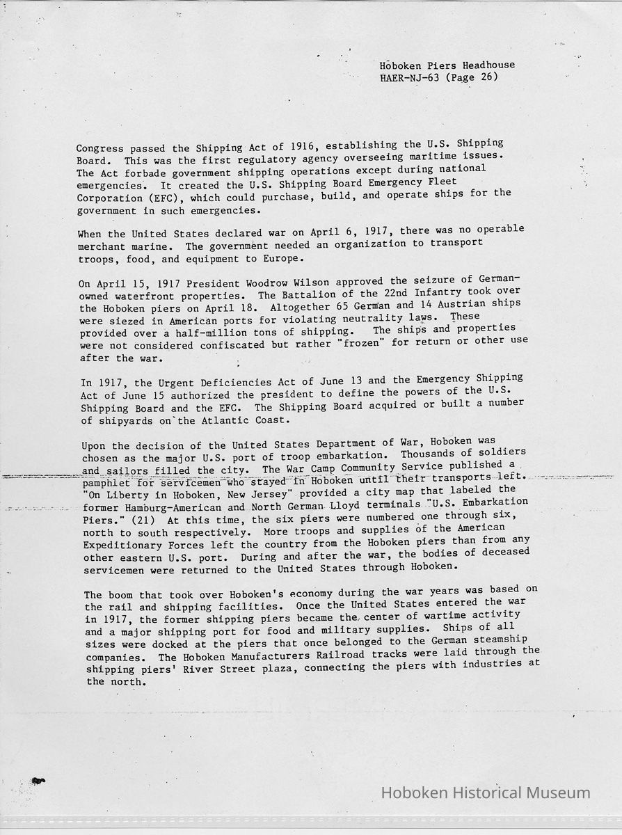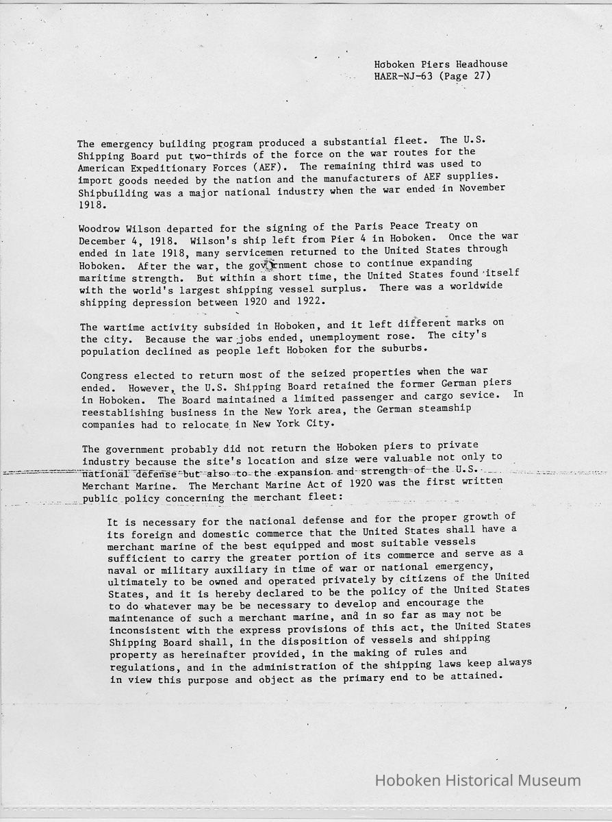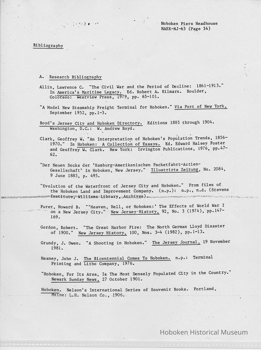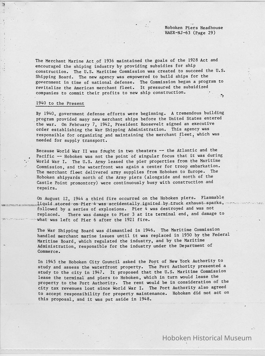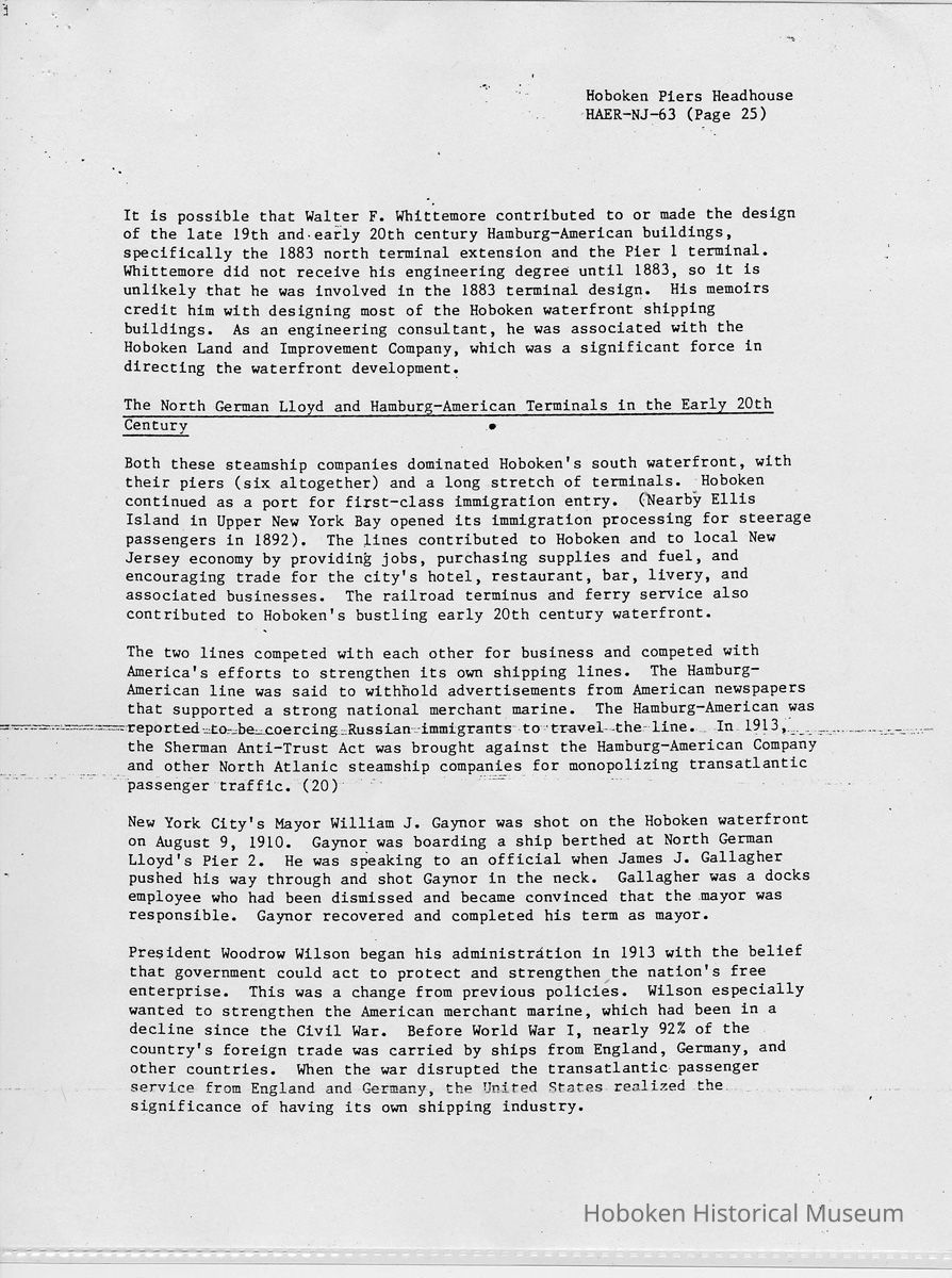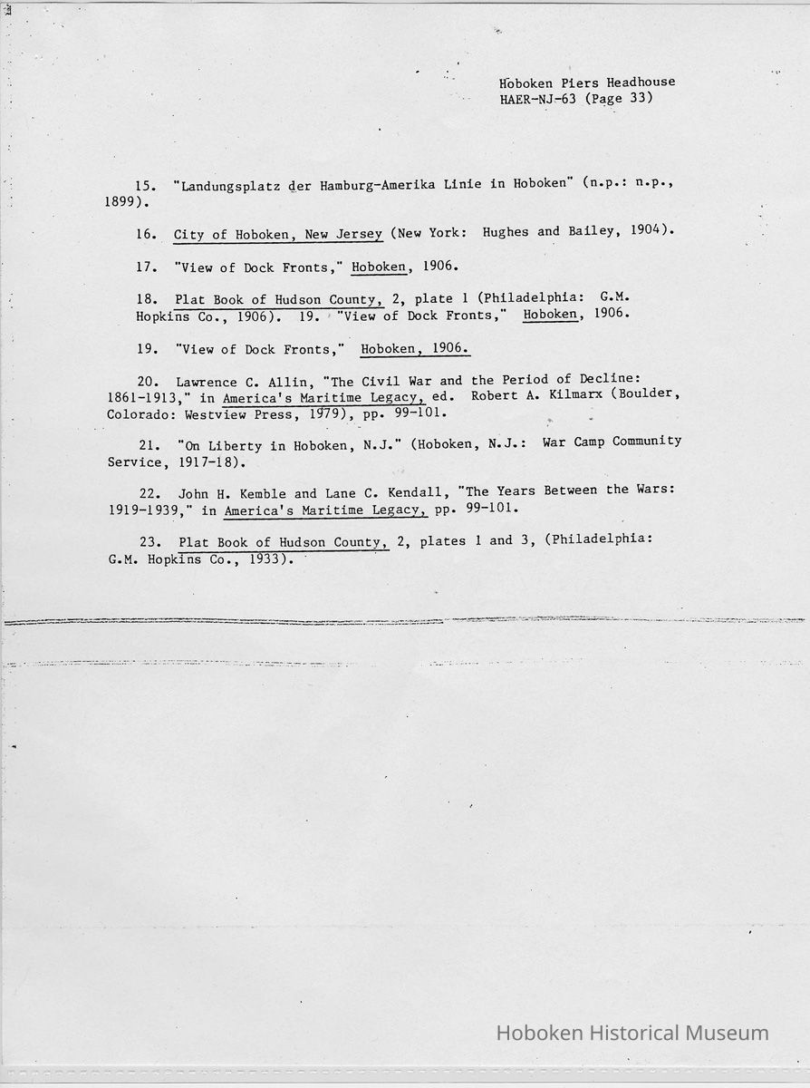 Report: Historic American Engineering Record: Hoboken Piers Headhouse. HAER - NJ - 63. Ca. 1986.