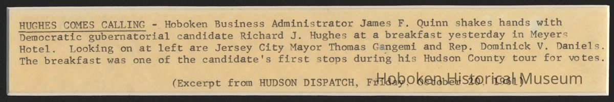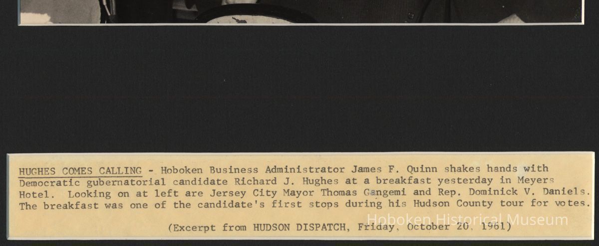 Matted in black matte with second window below with a typed caption being an excerpt of a caption that appeared with this photo in the Hudson Dispatch, Friday, October 20, 1961. Caption reads: HUGHES COMES CALLING - Hoboken Business Adminstrator James F. Quinn shakes hands with Democratic gubernatorial candidate Richard J. Hughes at a breakfast in Meyers Hotel. Lookin on at left [actually the right] are Jersey City Mayor Thomas Gangemi and Rep. Dominick V. Daniels [who is who is not indicated]. The breakfast was one of the candidate's first stops during his Hudson County tour for votes.