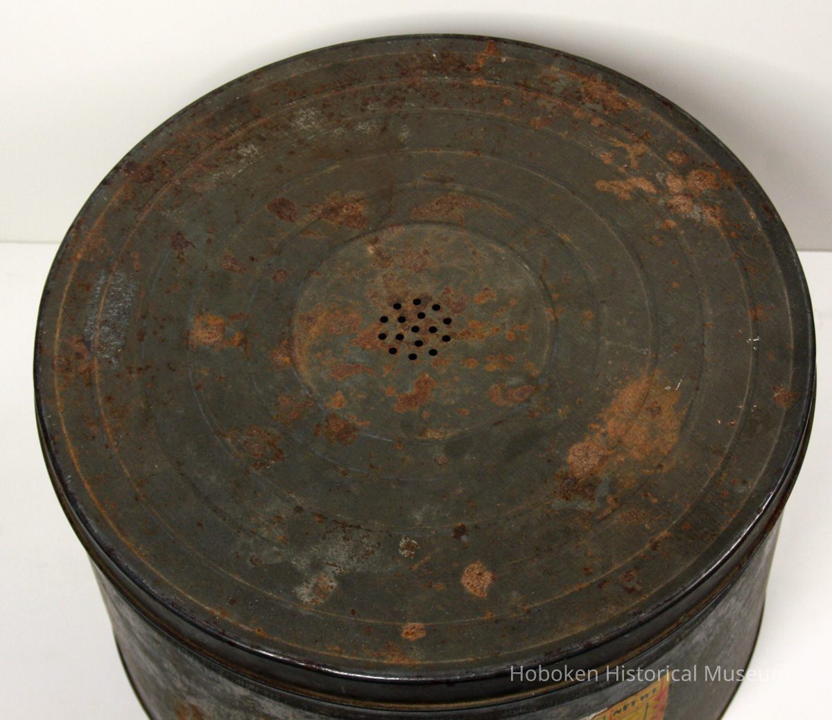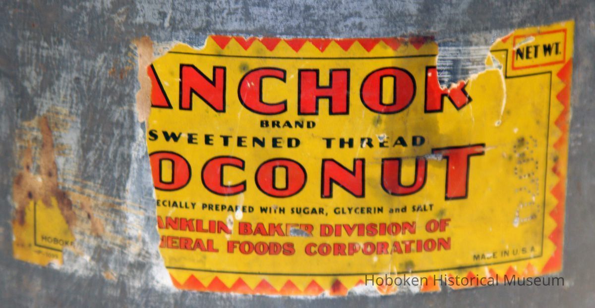 Metal can, Anchor Brand Sweetened Fancy Thread Coconut, [10 Pounds.] Manufactured by Franklin Baker Division of General Foods Corporation, Hoboken, N.J., no date, ca. 1928-1940. 12-1/4" diameter x 7-5/8" high tin with lift off lid perforated at the center with 1/8" diameter air holes grouped in a 1-1/4 diameter area; remains paper label printed in red, gold and black applied to the side, 8-3/4" wide x 3-3/4" high. Can worn and rusted in spots.
