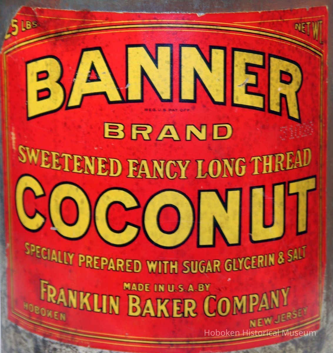 Can: Banner Brand Sweetened Fancy Long Thread Coconut. 25 lbs. Made by Franklin Baker Co. Hoboken, n.d., ca. 1920s.