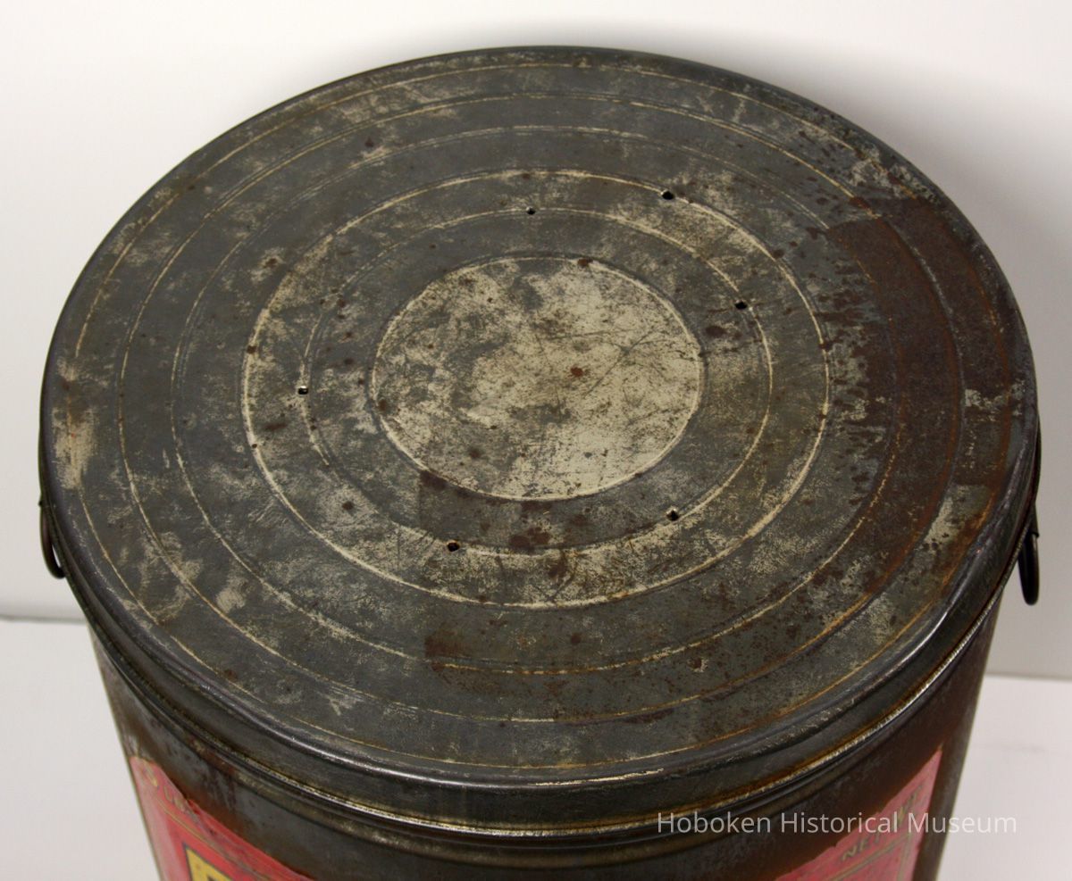 Metal can, Banner Brand Sweetened Fancy Long Thread Coconut. 25 pounds. Made by Franklin Baker Company, Hoboken, N.J., no date, circa 1924-1927. 12-1/4" diameter x 15-1/2" high tin with lift off lid; paper label printed in red, gold and black applied to the side,13" wide x 10-1/2" high; 2 ring handles soldered to side.