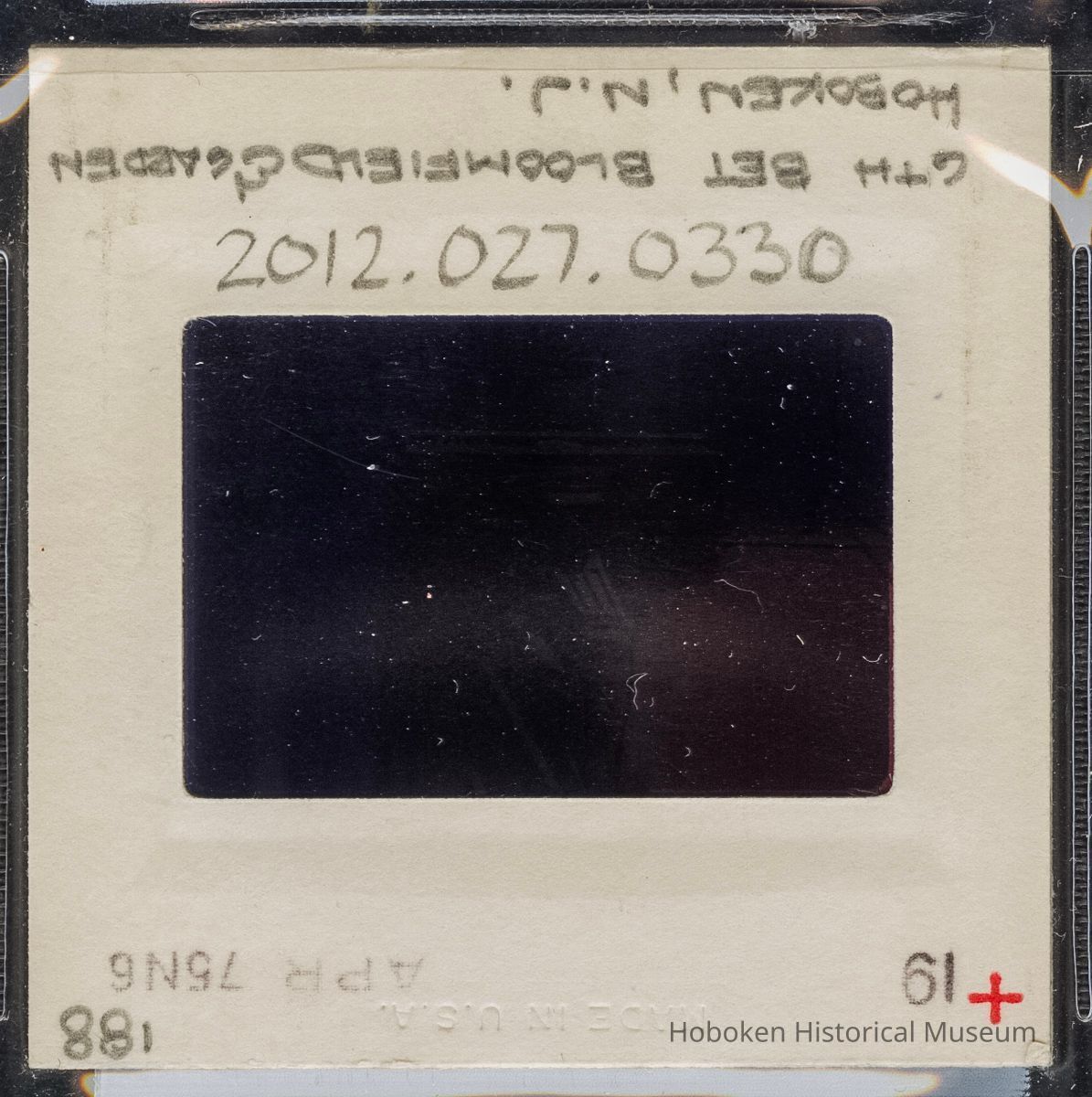 Color slide of detail view of cornice, brackets and fire escape at 155 6th between Bloomfield and Garden