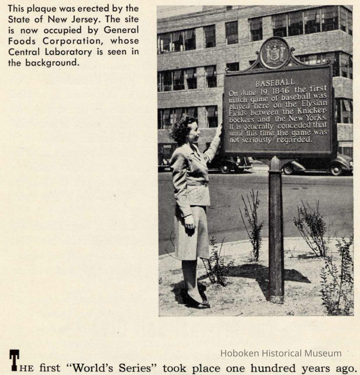 Printed black-and-white photo of the bronze plaque placed at Eleventh St. and Hudson Street in 1946 commemorating the 1846 game at Elysian Fields, Hoboken. Image from page [3] of archives catalog 2003.019.0133. Photographer not known. Woman is not identified.