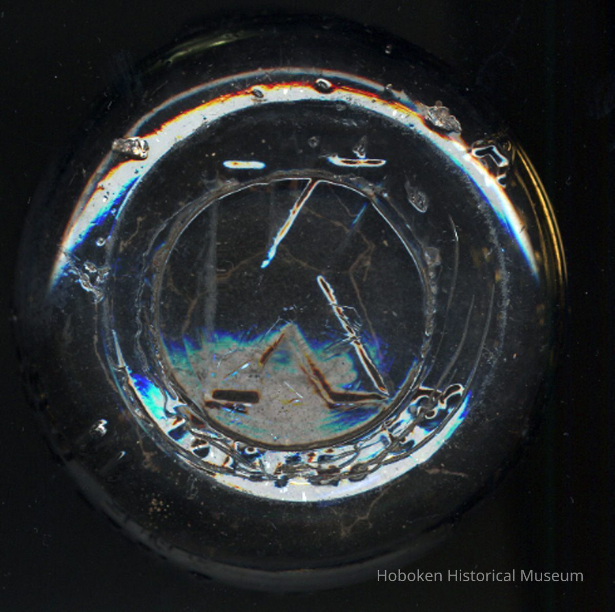The Keystone Dairy Co., New York, Brooklyn, Hoboken, N.J. One pint milk bottle. No date, circa 1950-1960. Clear mold blown glass, 3-1/4" diameter x 7-5/16" high; embossed lettering front, back and bottom. Probably made by Thatcher Glass Manufacturing Co.
