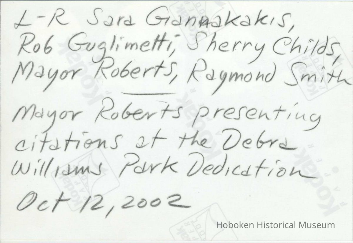 Color photo of the presentation of citations at the Deborah Williams Memorial Playground dedication ceremony, Hoboken, October 12, 2002. 4" x 6" wide print. Holographic pencil notations on the reverse (by Raymond Smith).