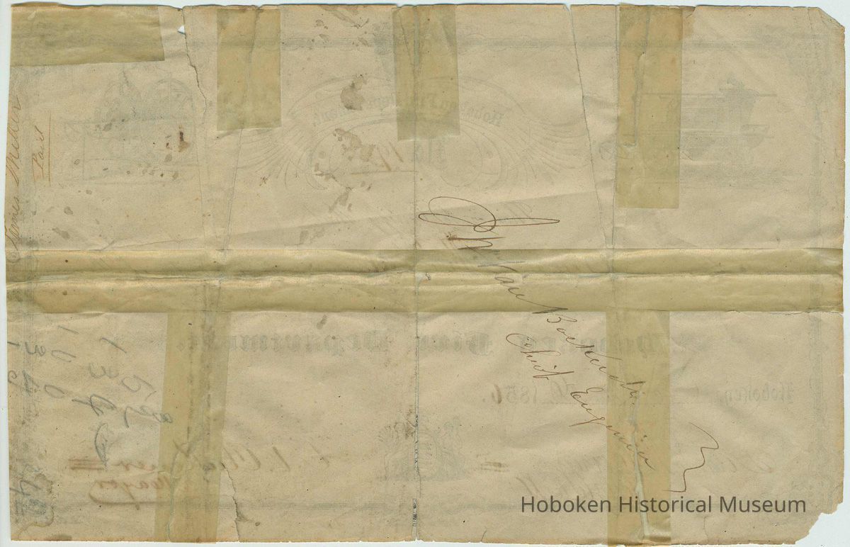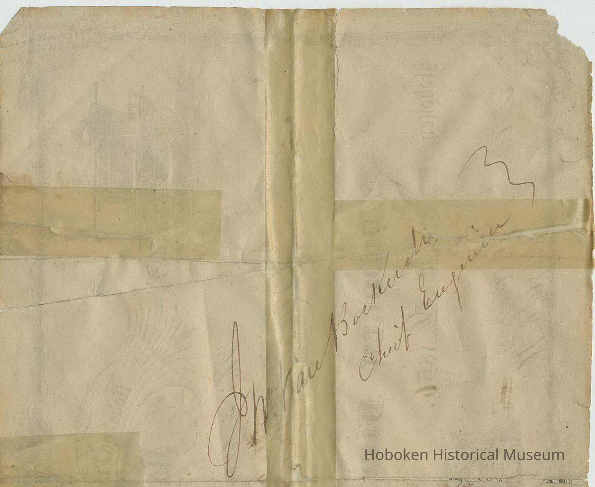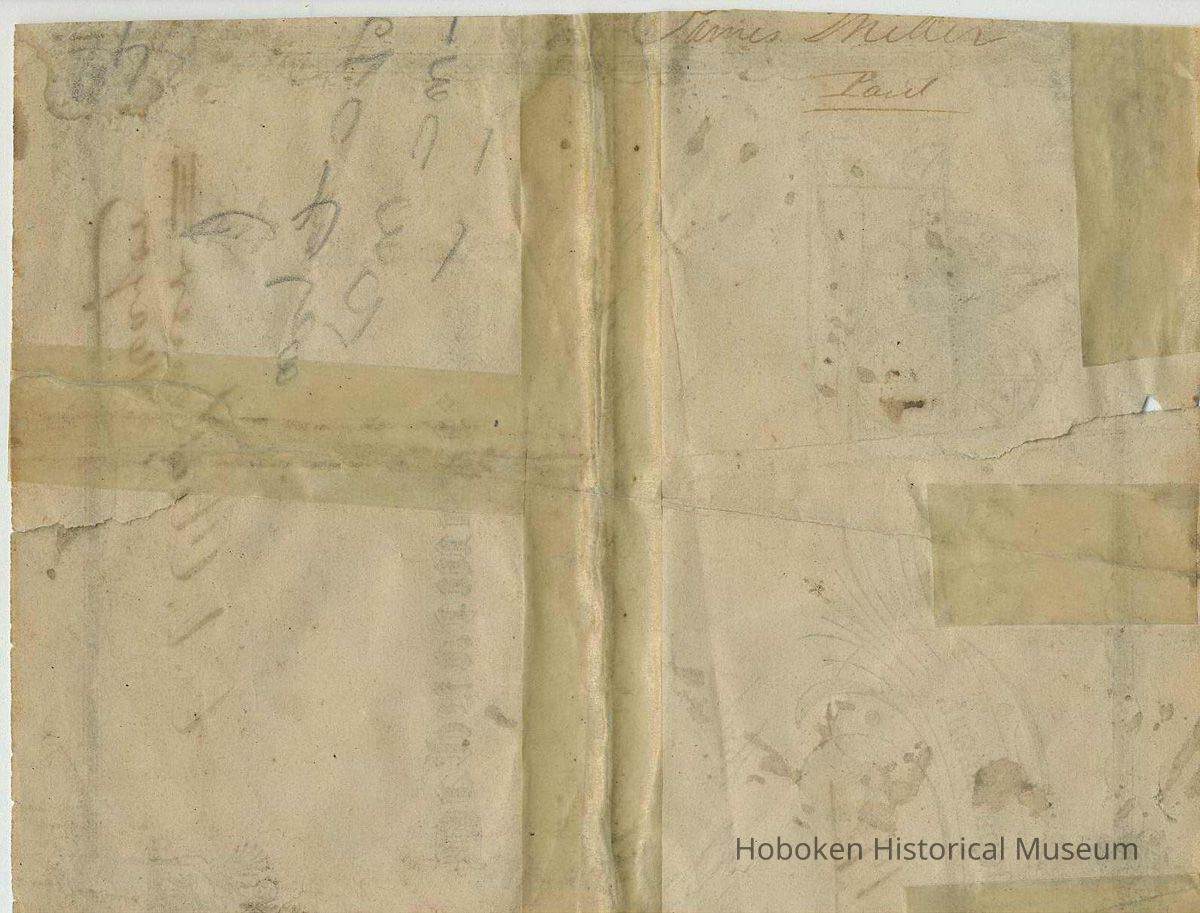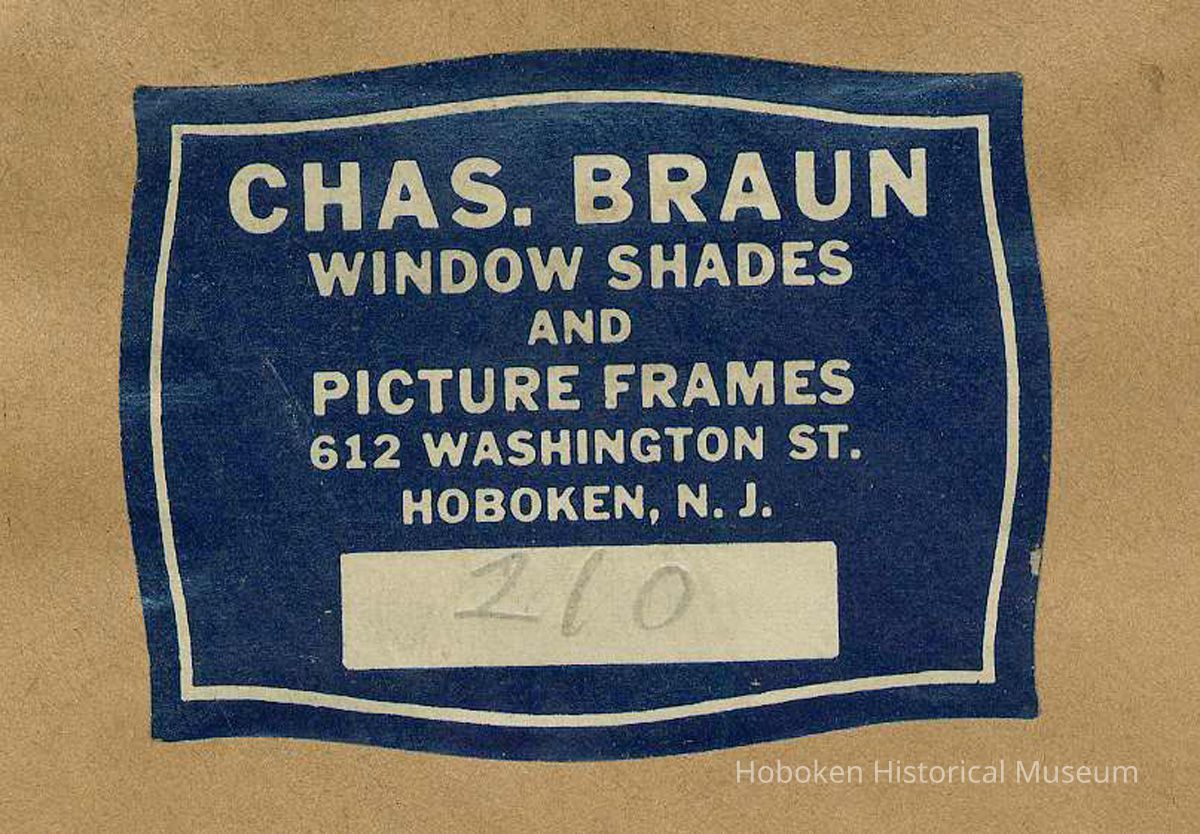 (It was previously framed ca. 1940-50: frame was removed; label is imaged. The backing board had paper label for Charles Braun, Window Shades and Picture Frames, 612 Washington St., Hoboken, N.J. cf. image 5 in this record.)